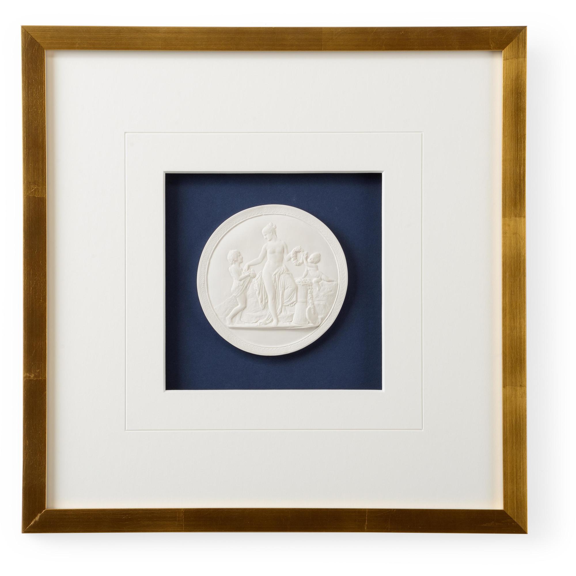 Intaglios on a navy background with an 8 ply mat with v-groove in gold leaf frame. Framed with glass.