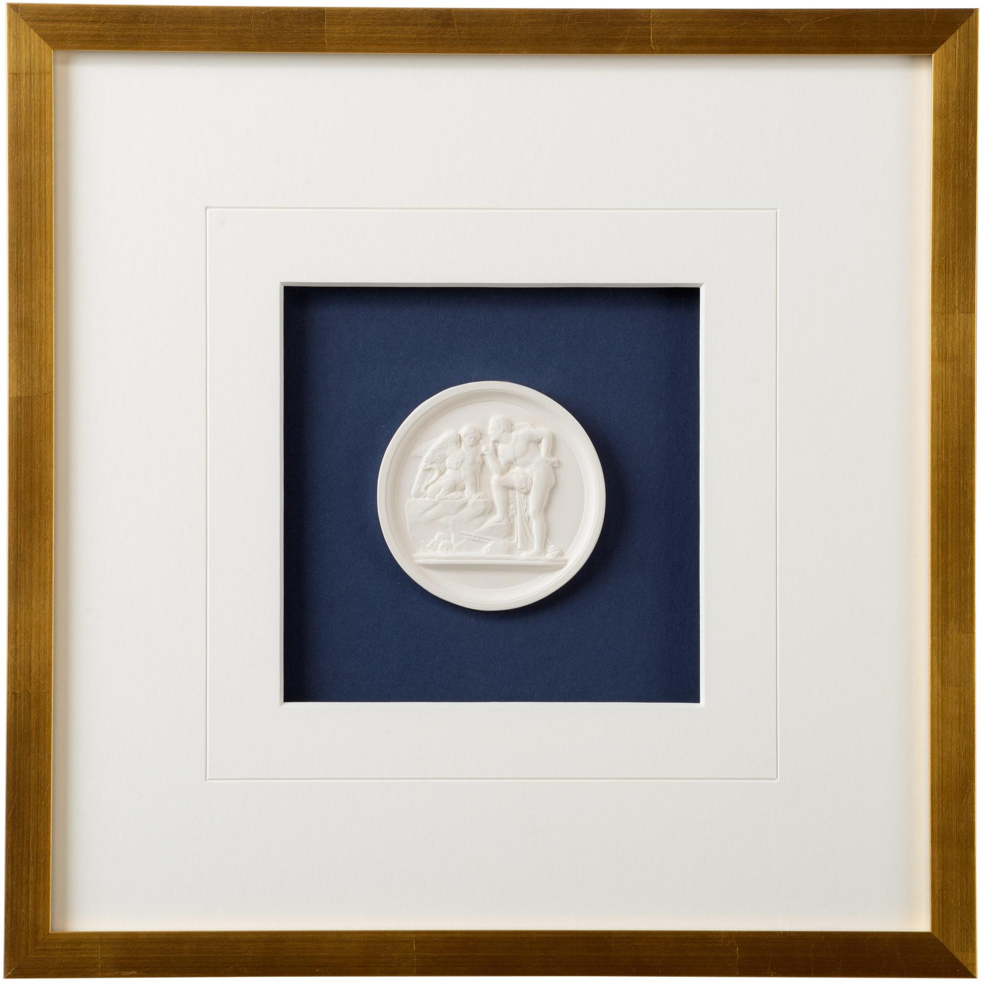 Intaglios on a navy background with an 8 ply mat with v-groove in gold leaf frame. Framed with glass.
