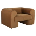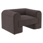A bold take on contemporary style, this armchair will stand out in any space. Features rounded back and arm rests for ultimate comfort. Fully upholstered in luxurious meg taupe, ash and gold fabrics. Pair with coordinating sofa to complete the look.