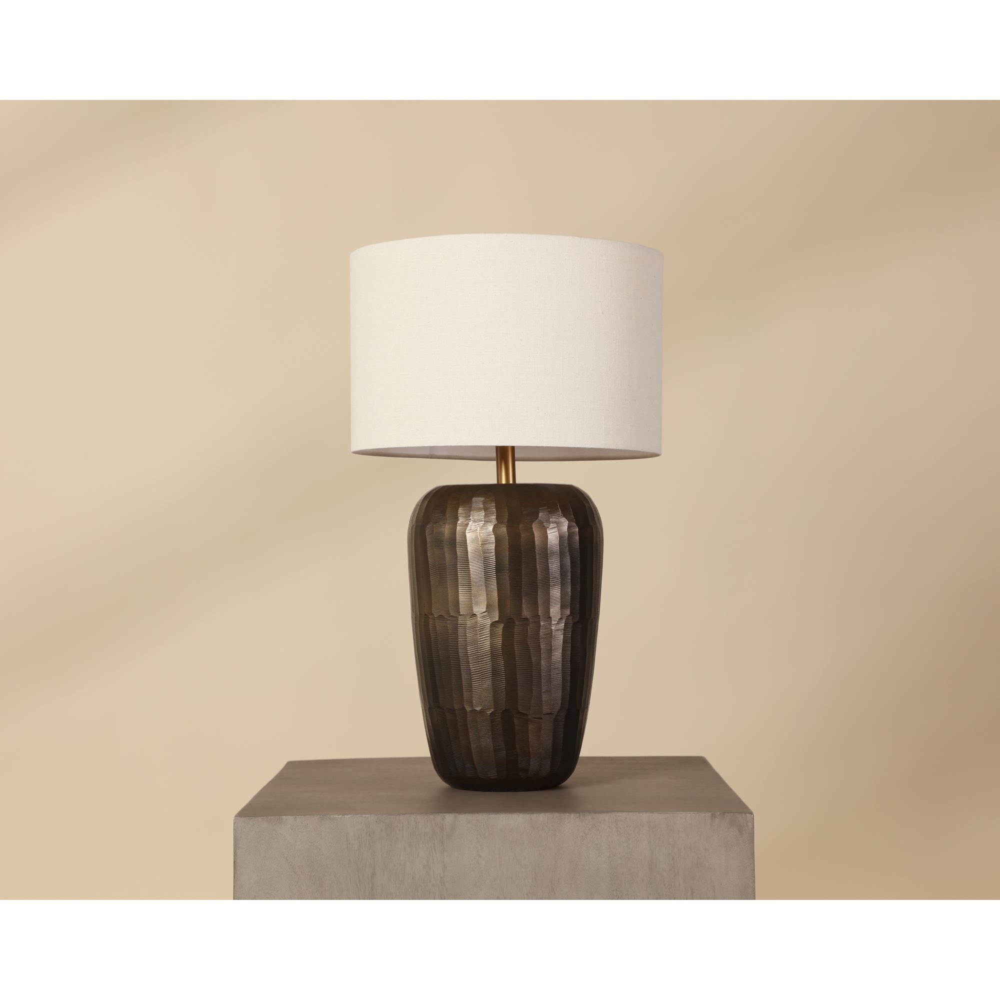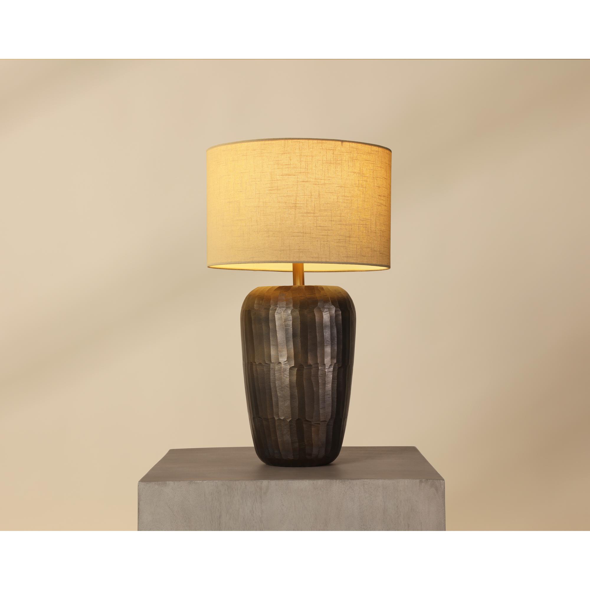 A true expression of handcrafted artistry, the Ishani Table Lamp plays with texture and shape. The warm hand-hammered metallic base contrasts a taupe drum shade, creating a piece that’s both bold and easy to layer into any interior.