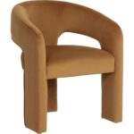 Clean lines and contoured arches add style and structure to this contemporary dining chair. Features a curved backrest and open back for optimal comfort. Eye-catching from all angles. Fully upholstered in ernst sandstone fabric.