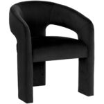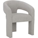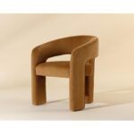 Clean lines and contoured arches add style and structure to this contemporary dining chair. Features a curved backrest and open back for optimal comfort. Eye-catching from all angles. Fully upholstered in copenhagen olive fabric.
