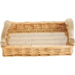 Amanda Lindroth’s Signature Island Tray made from natural willow with fine mocha colored leather handles & a fitted tempered glass insert. Smaller sizes work beautifully as a bedside table or desk accent. Large sizes function with equal ease as ottoman decor or for carrying cocktails. Small: 12″L x 9″W, Large: 23 1/2″L x 14″W