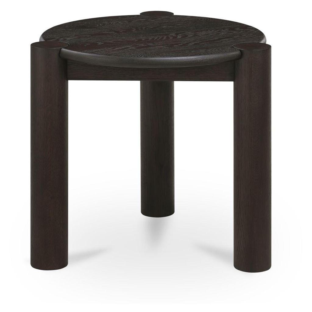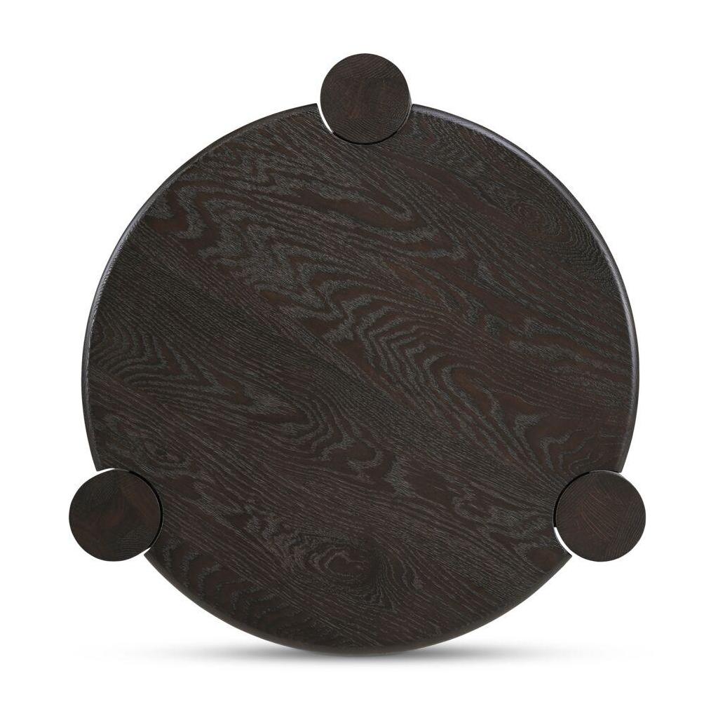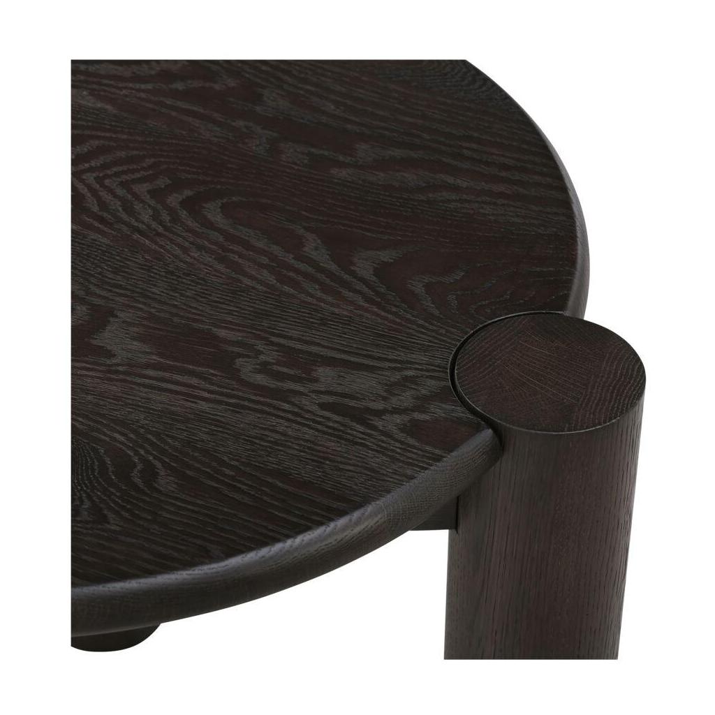 Built to round things out. A solid oak top with a smooth bullnose edge meets four sculptural column legs in a bold joinery detail that’s all craft and confidence. The legs add weight and definition to the rounded form, striking a balance between soft curves and strong structure. Finished in a wire-brushed dark brown, it’s grounded, sculptural, and made to hold a drink (or two).