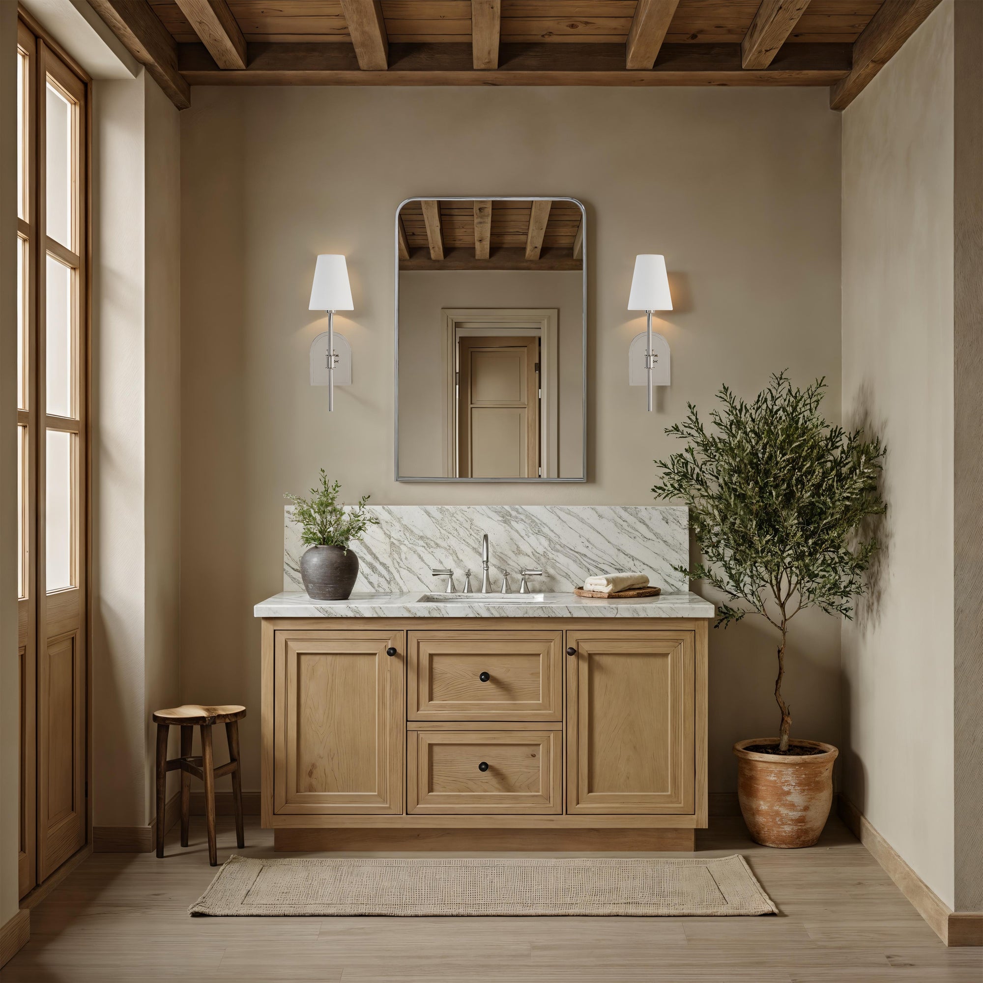 Possessing a modern and timeless quality at once, this mirror complements decor elements in its vicinity while making a stylish statement of its own. At 24 by 36 inches, it holds idyllic dimensions to rest atop a vanity or dresser. With a gold powder-coated iron frame, it is an optimal fit within a mid-century modern interior, with the ability to go classic when styled for such.
