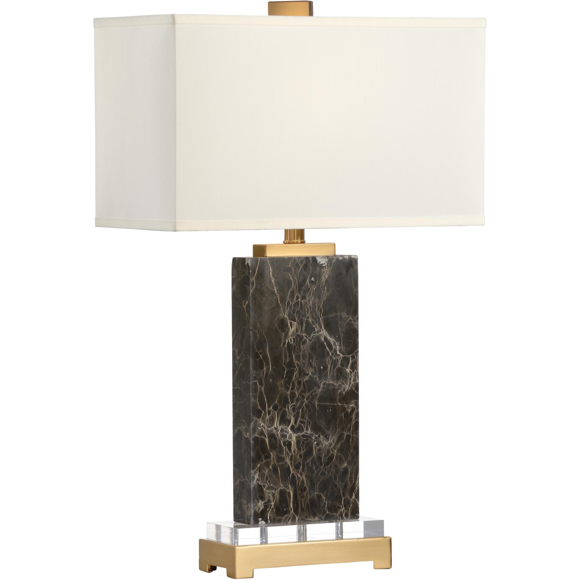 A masculine design combines with feminine accents to create this 27.5″ contemporary table lamp. Jackson lamp features a rectangular slab of natural brown marble juxtaposed by the soft golden accents and clear acrylic base. An elegant off white silkette shade tops the design that blends effortlessly with your existing decor.
