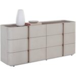 This contemporary dresser is defined by its beautiful and gentle curves. Wrapped in cream faux leather with a brown oak veneer tabletop that is sure to impress. Includes six drawers and completed with a solid acacia wood base.