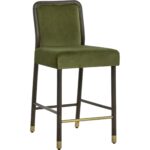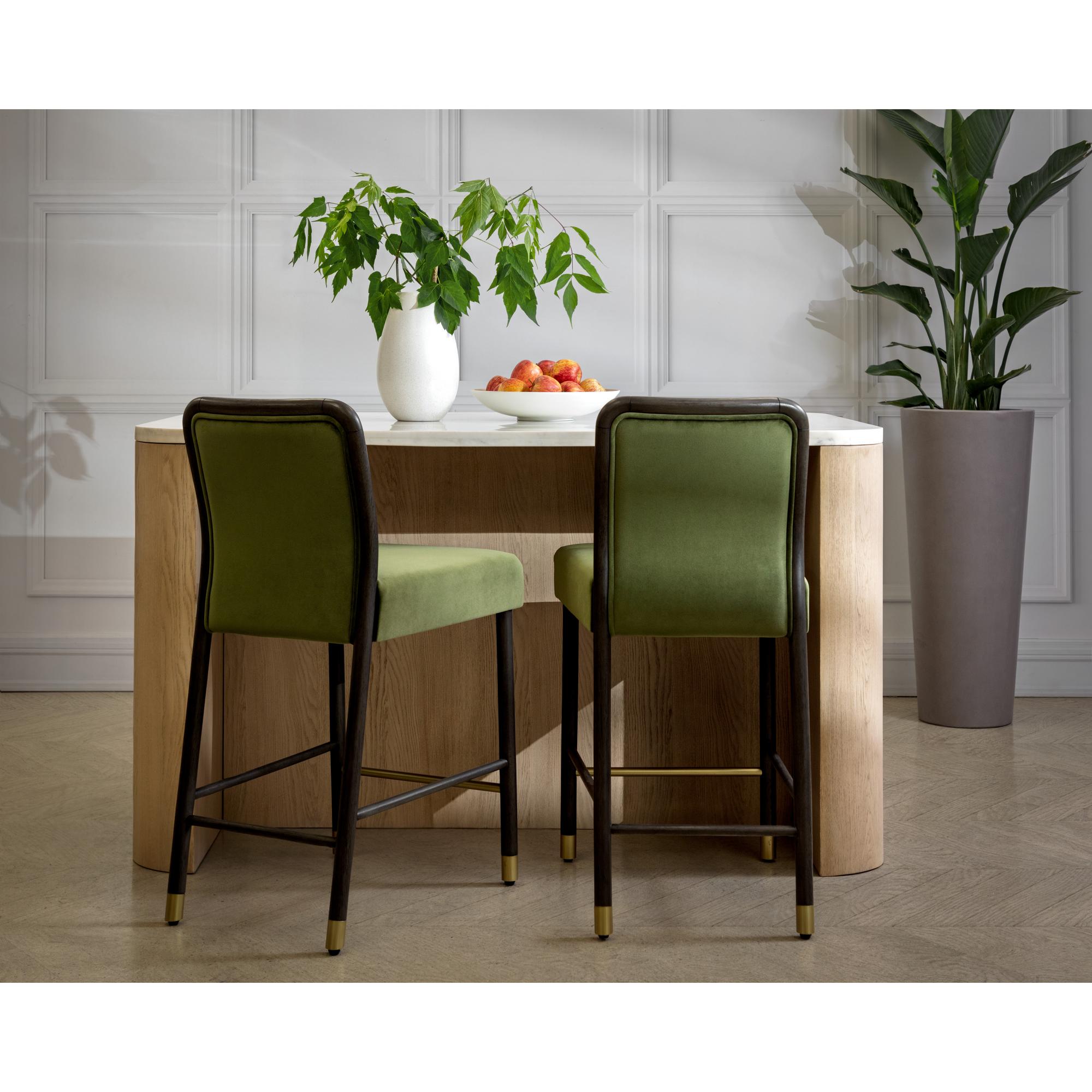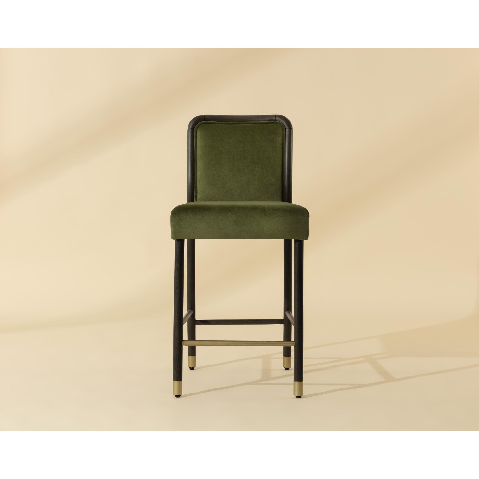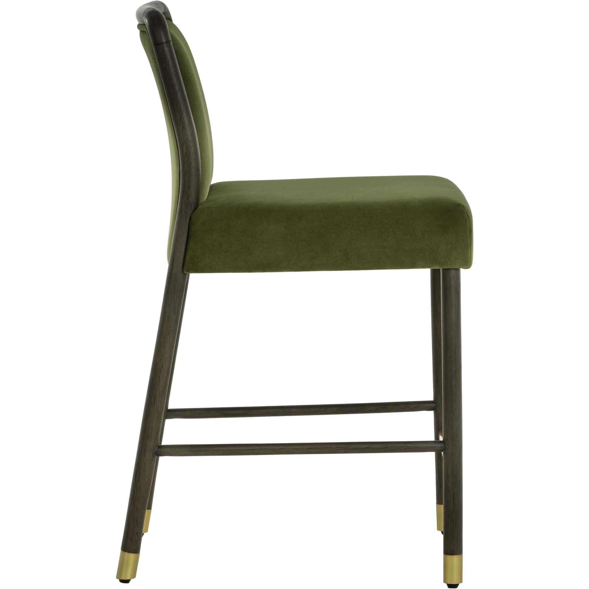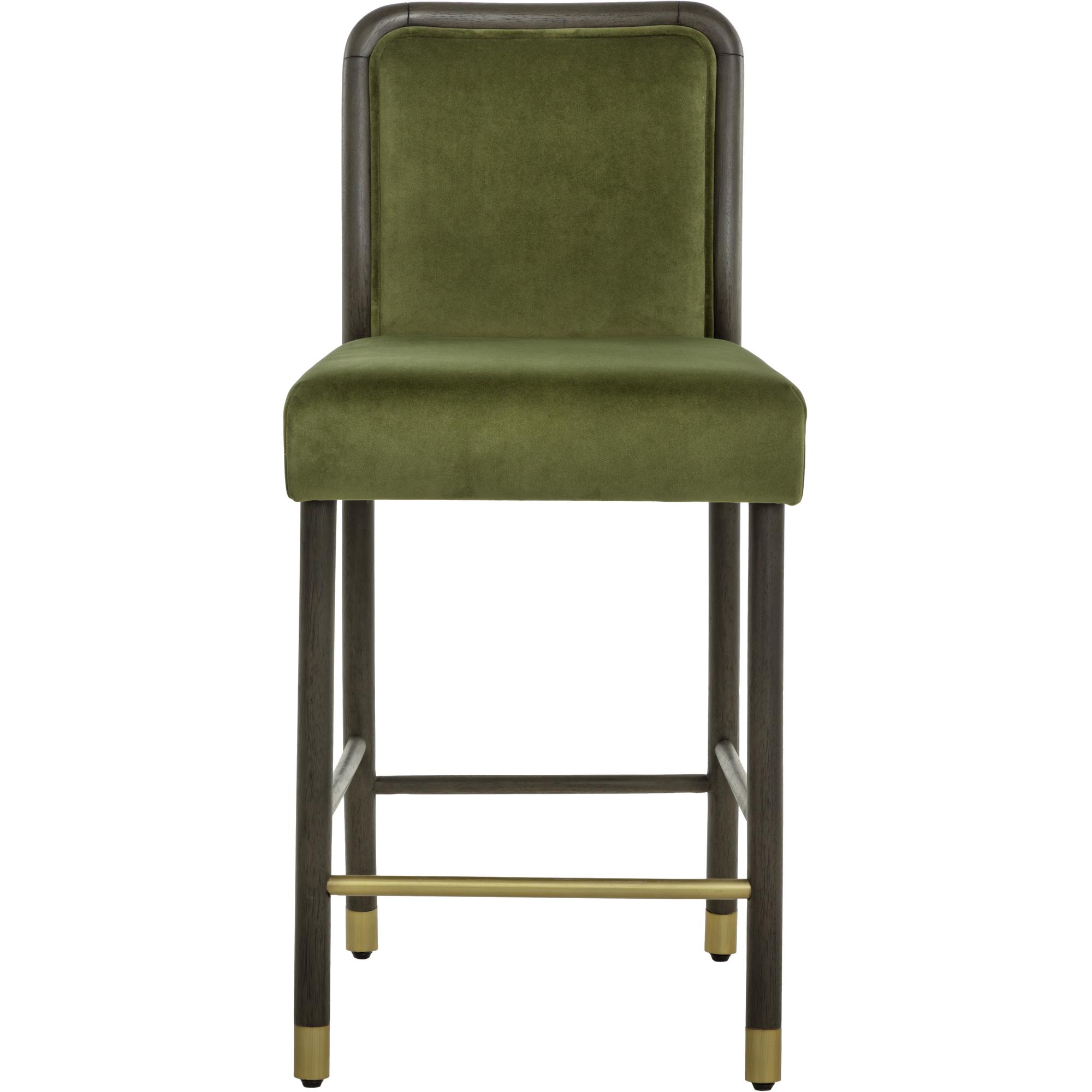 The Jeno Counter Stool is a sophisticated study of mid-century design. A velvet fabric seat in meg olive combined with a smoke grey rubberwood frame gives a striking balance of impeccable style and comfort. Brass metal stretchers and foot caps enhance the overall look.
