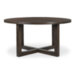 Crafted from solid oak, the Joel dining table’s 40mm thick round top features a thoughtfully crafted V-groove, adding a visual lightness to the substantial surface. The geometric base, with crisscrossing stretchers, grounds the piece with quiet confidence. A dark brown, wire-brushed finish enhances the oak’s natural beauty, creating a focal point of understated elegance.