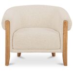 The Jones accent chair’s gracefully curved back and sophisticated fold-over detail showcase transitional tub-style, while soft upholstery creates a sleek silhouette. Plush cushioning invites leisurely moments, cradled in comfort, while exposed solid rubber wood legs, enhanced by a wire-brushed finish, add warmth and character.
