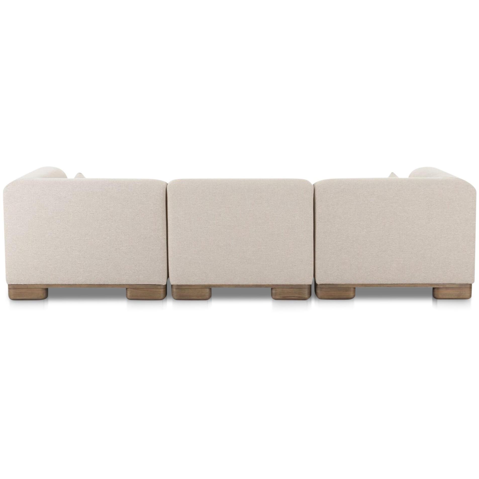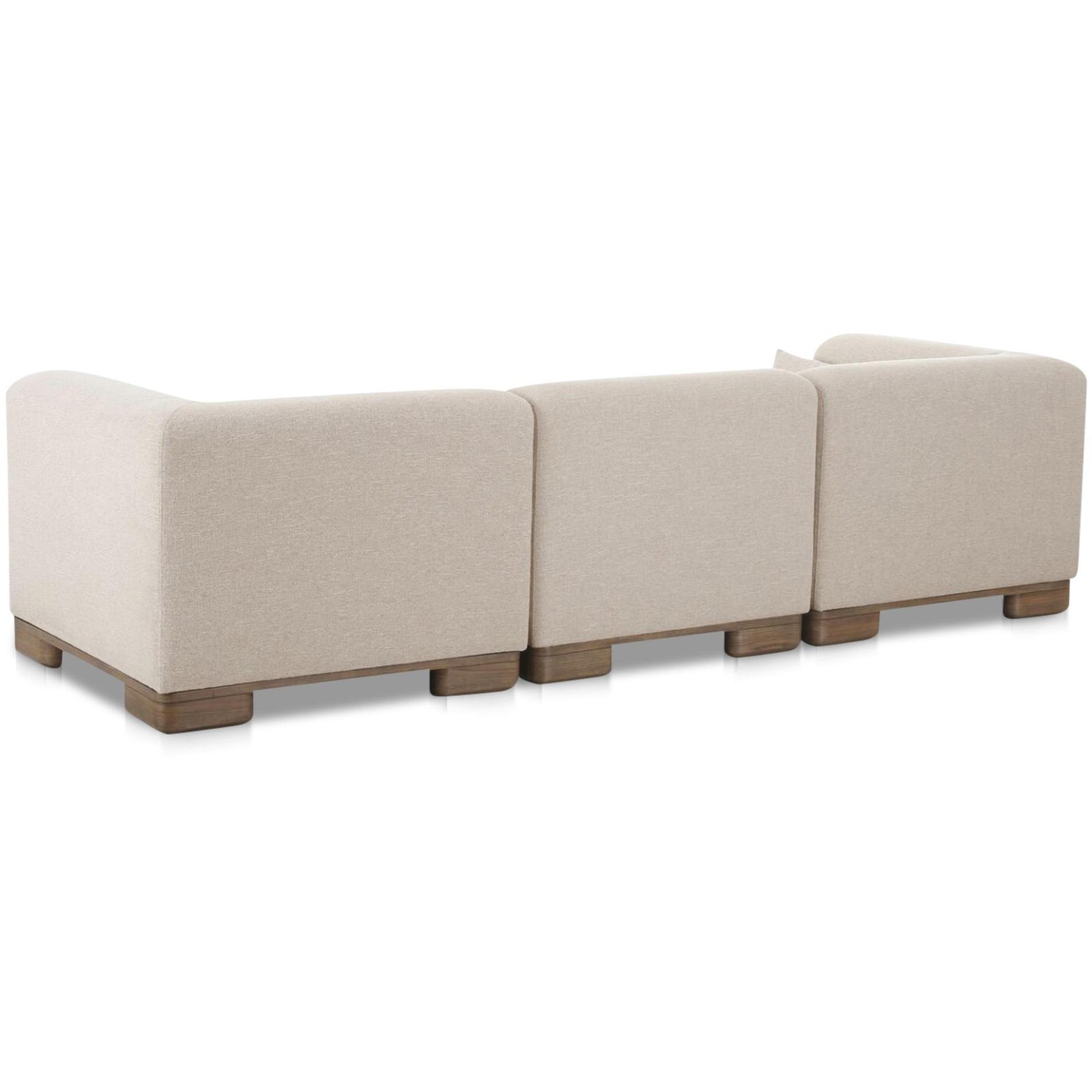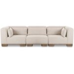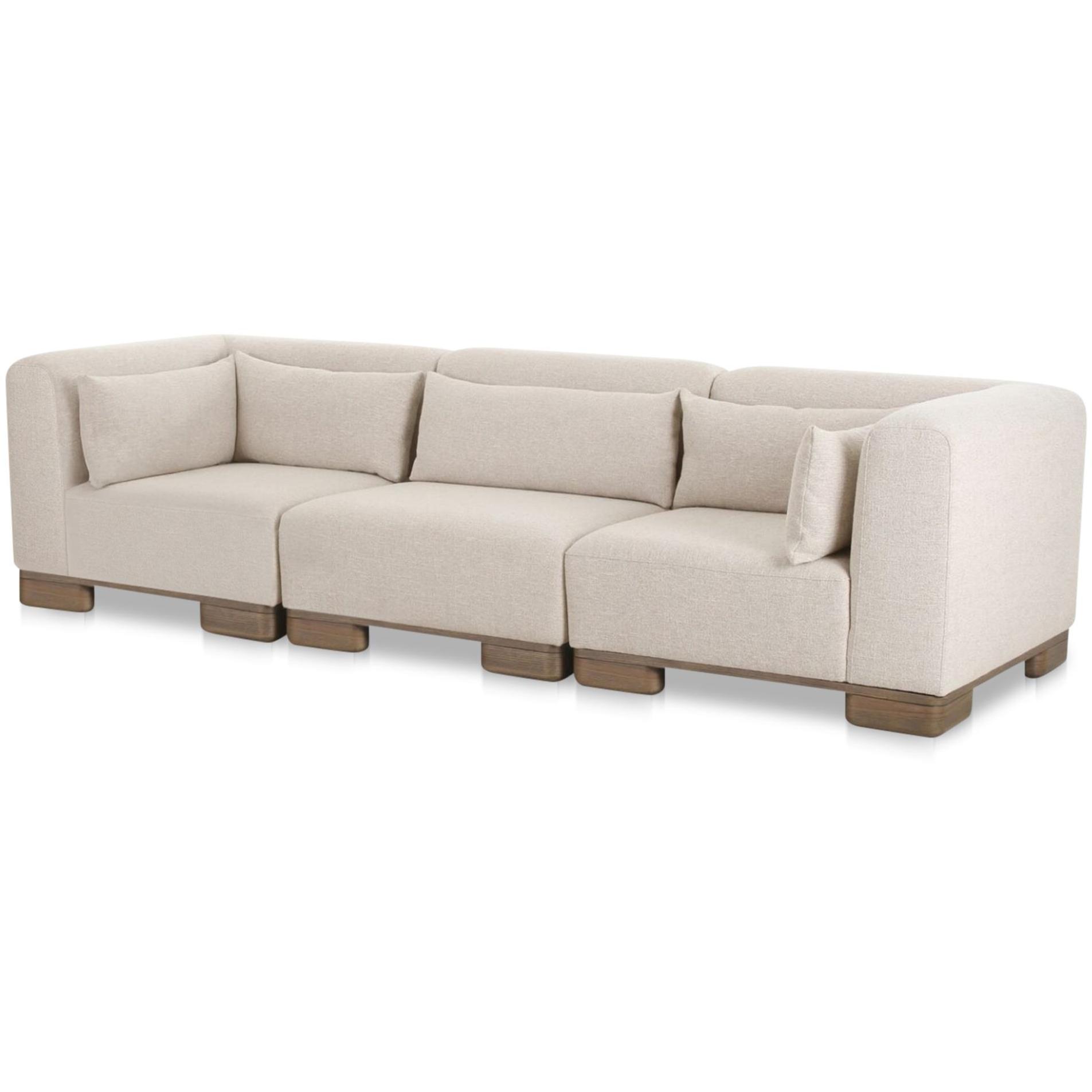 June is your living room’s reset button. This modular trio lets you lounge now and remix later, working as free-standing pieces or a connected setup. Oatmeal performance fabric adds warm texture, lifted by oversized oak veneer legs for breathing room. Inside, foam plus feather and fiber fill brings that pillow-like sink, with lumbar toss cushions to keep comfort balanced. Solid wood and plywood framing keeps everything steady through sprawl and movie marathons too.