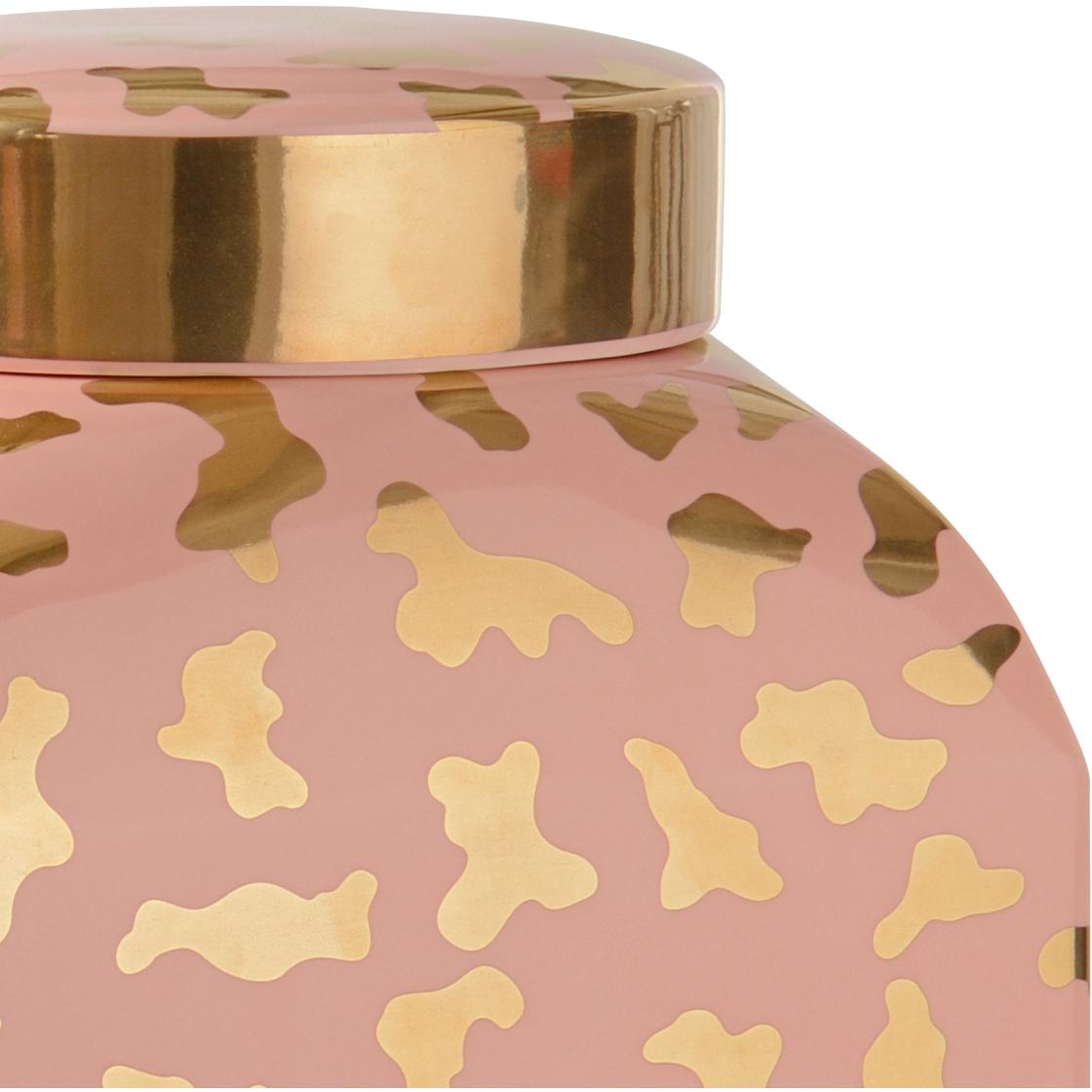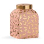 The smallest member of the ginger jar trio featuring a unique metallic satin gold cheetah print. (Available in a variety of colors: search Jungle Ginger). Designed by Shayla Copas.