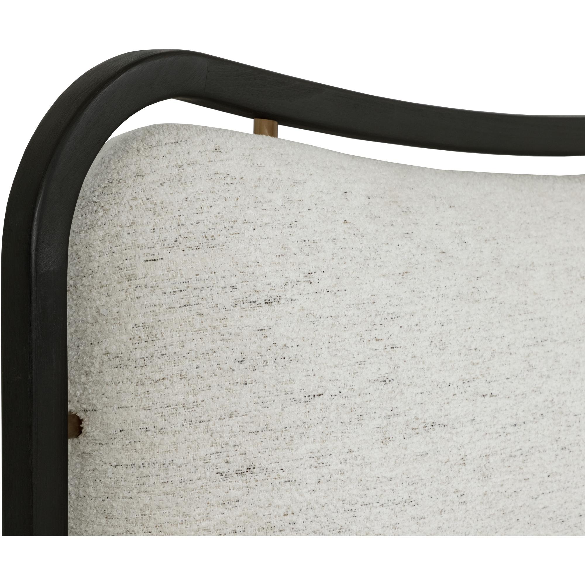 A subtle concave dip in both the headboard and footboard defines the sculptural profile of the Junia Bed. Upholstered in textured boucle, the frame is outlined in curved beech wood trim with decorative brushed gold metal connectors. This modern statement piece exudes versatile appeal for both residential and hospitality spaces.
