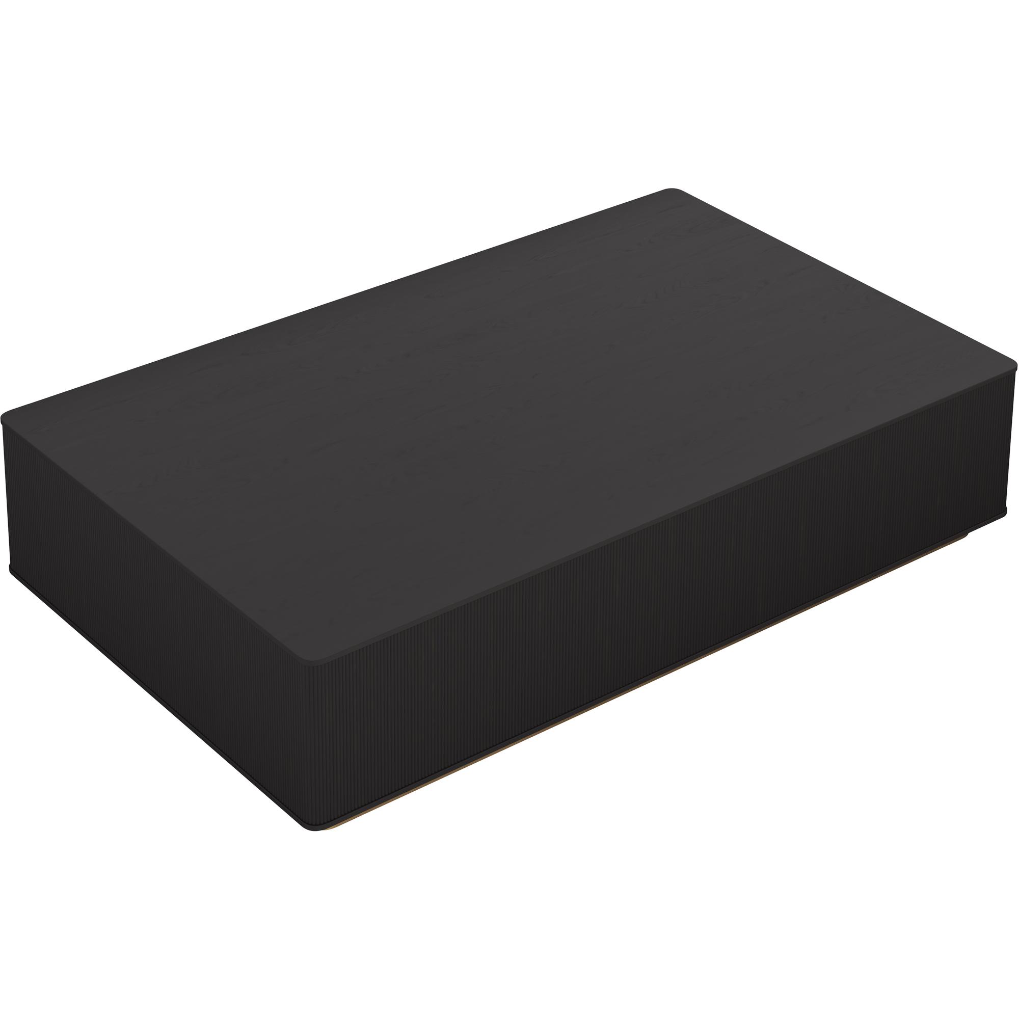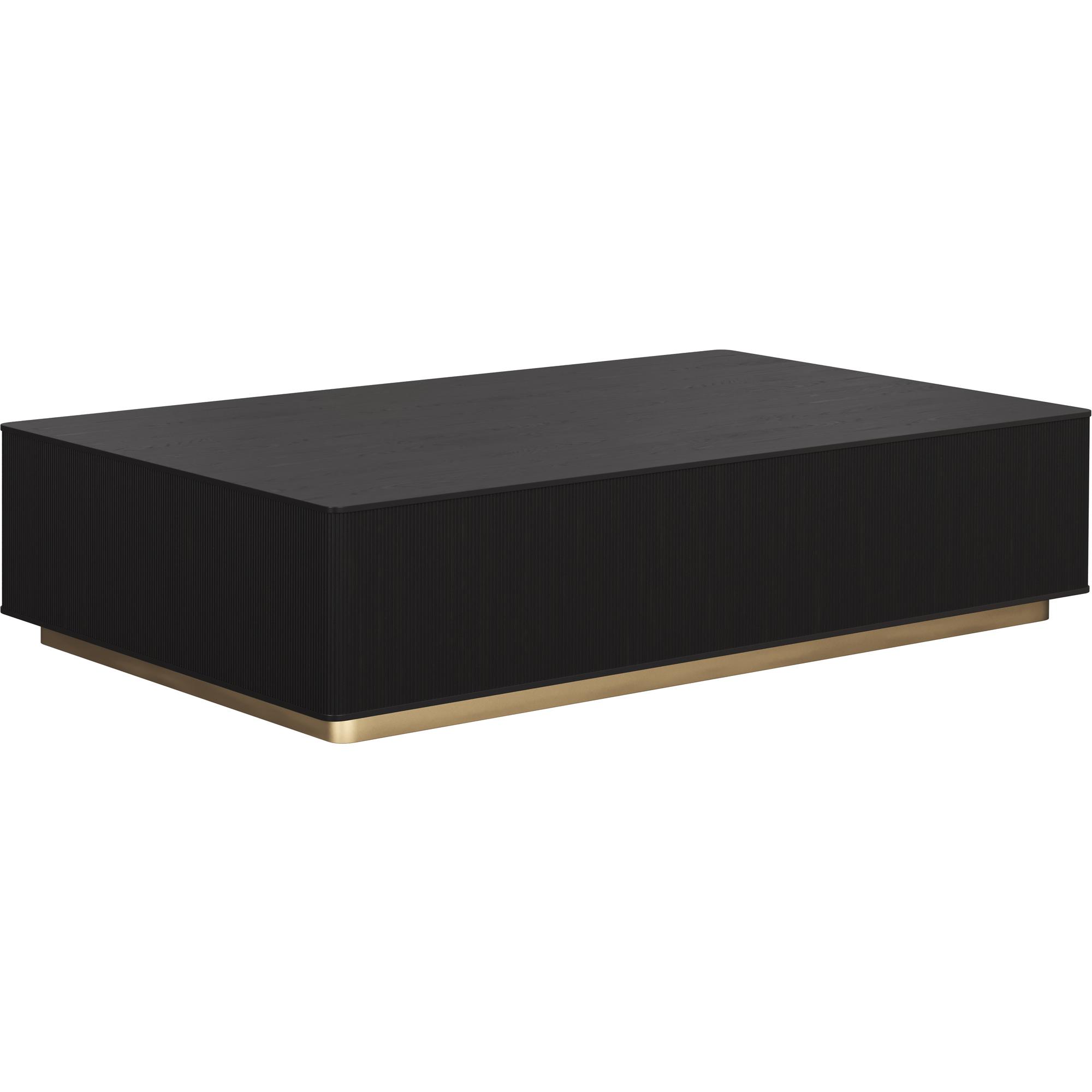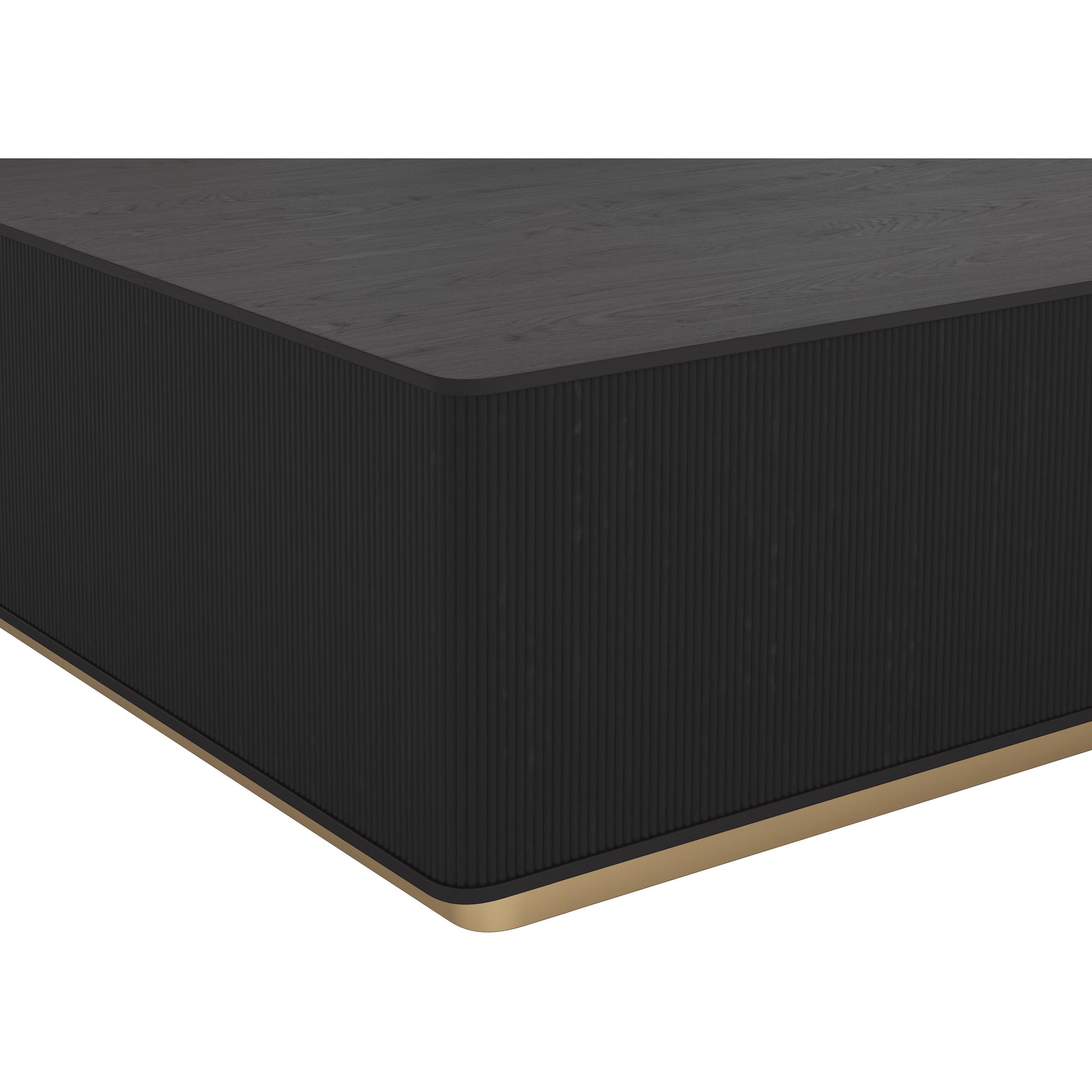 The Kalla Coffee Table brings form and function to life. Crafted with charcoal grey oak wood and oak veneer with vertical reeding. A brushed gold steel base finishes the look.