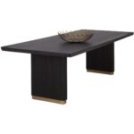 The Kalla Dining Table brings form and function to life. Crafted with a rustic oak veneer table top with a chamfered edge. Vertical reeding on a solid oak wood base with brushed gold steel detailing at the bottom finishes the look. As wood is an organic, porous material, these pieces will contain natural variation of texture and may also exhibit fine indentations and cracks. Wood pieces will also display a disparity of colour and grain, and visible knots and burls that add to the character of each piece.