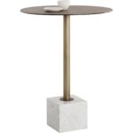 Add a touch of opulence to any space with this spectacular bar table. Features a brushed antique brass frame with mesh patterning on the tabletop. Completed with a grey marble block base. Also available in white marble. Made in India. With refined craftsmanship, this design was brought to life by skilled local artisans. By nature, these materials develop unique imperfections such as fissures, markings and colour variations for a truly one-of-a-kind piece.