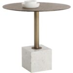 Add a touch of opulence to any space with this spectacular bistro table. Features a brushed antique brass frame with mesh patterning on the tabletop. Completed with a grey marble block base. Also available in white marble. Made in India. With refined craftsmanship, this design was brought to life by skilled local artisans. By nature, these materials develop unique imperfections such as fissures, markings and colour variations for a truly one-of-a-kind piece.