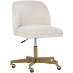 With a modern and minimalist design, this office chair is a marvelous addition to any workspace. Stocked in belfast oatmeal and navy fabrics with an adjustable seat. Completed with a gold steel base with added castors for mobility.