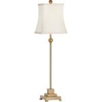 Enhance your dining experience with this simple yet elegant buffet lamp. Featuring an antique brass finish on square tiered base, straight column and small orb, the Kensington Buffet Lamp is a transitional design that will illuminate your space. A square cream shade and classic ball finial complete the look.