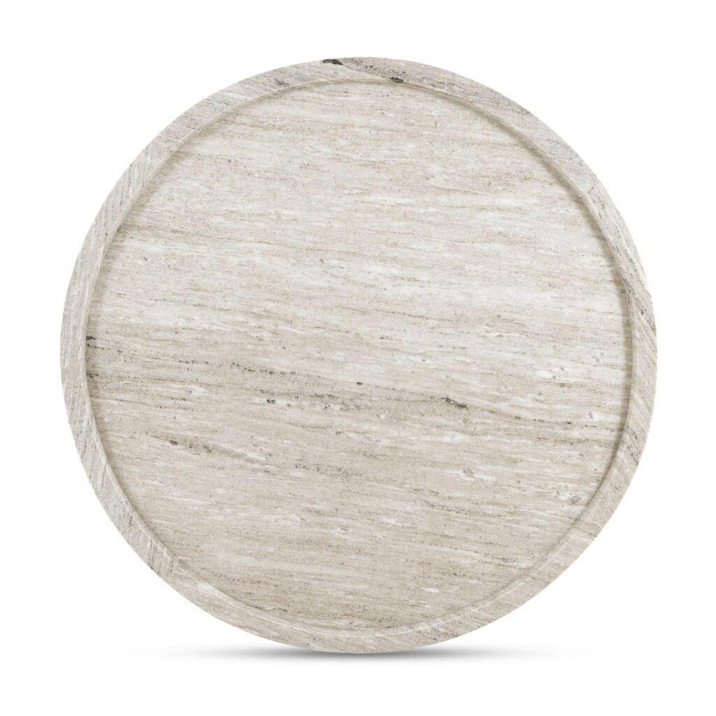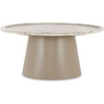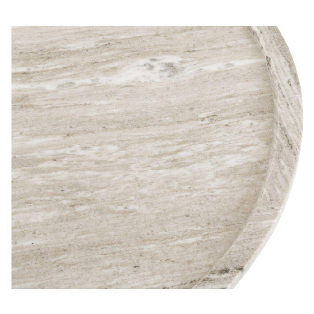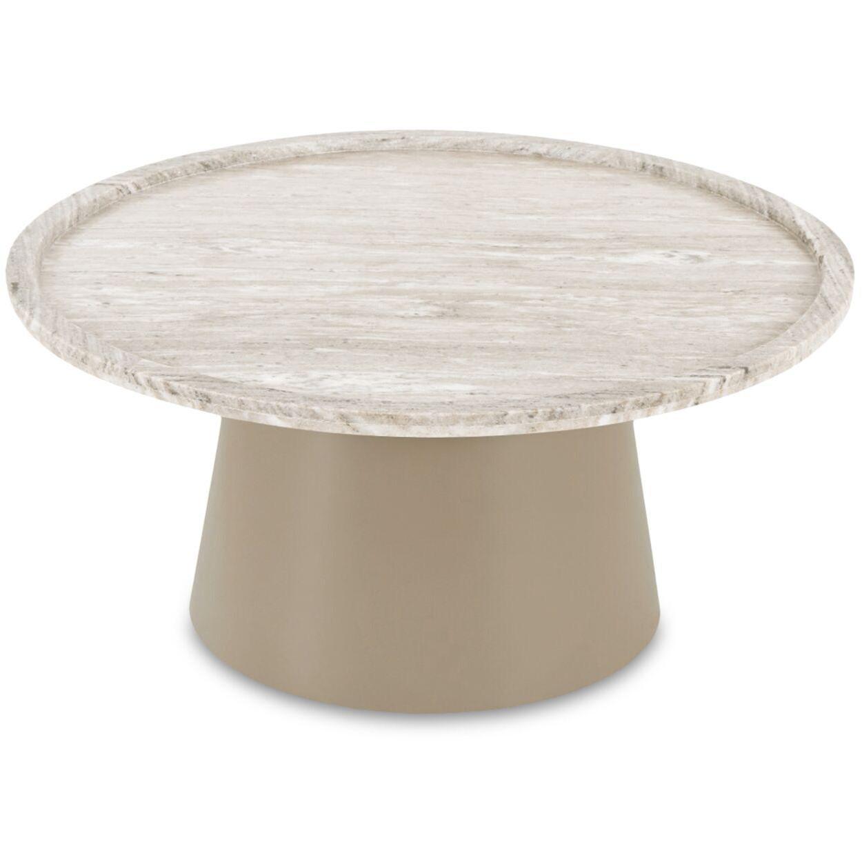 The Kimberley Coffee Table is a blend of cool materials and warm tones. A rounded tray-shaped top of antique white marble featuring subtle veining rests upon a camel-colored iron sheet base that angles outward with grace. This piece marries practicality with refined aesthetics—its tray top offer security, its design timeless appeal.