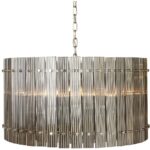 Dazzling and eye-catching, small, modern chandelier will add a stunning display of radiance to any space. Features a clear fluted glass design with a complementing metal frame in a brass finish. Large version also available.