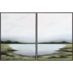 Peek into the natural world outside with this diptych that shows a calming lakeside marsh view. Pair the two pieces together to create a full landscape or hang them separately. Features a black wood floater frame. Each artwork is hand-painted and will feature slight variations that make every piece unique.