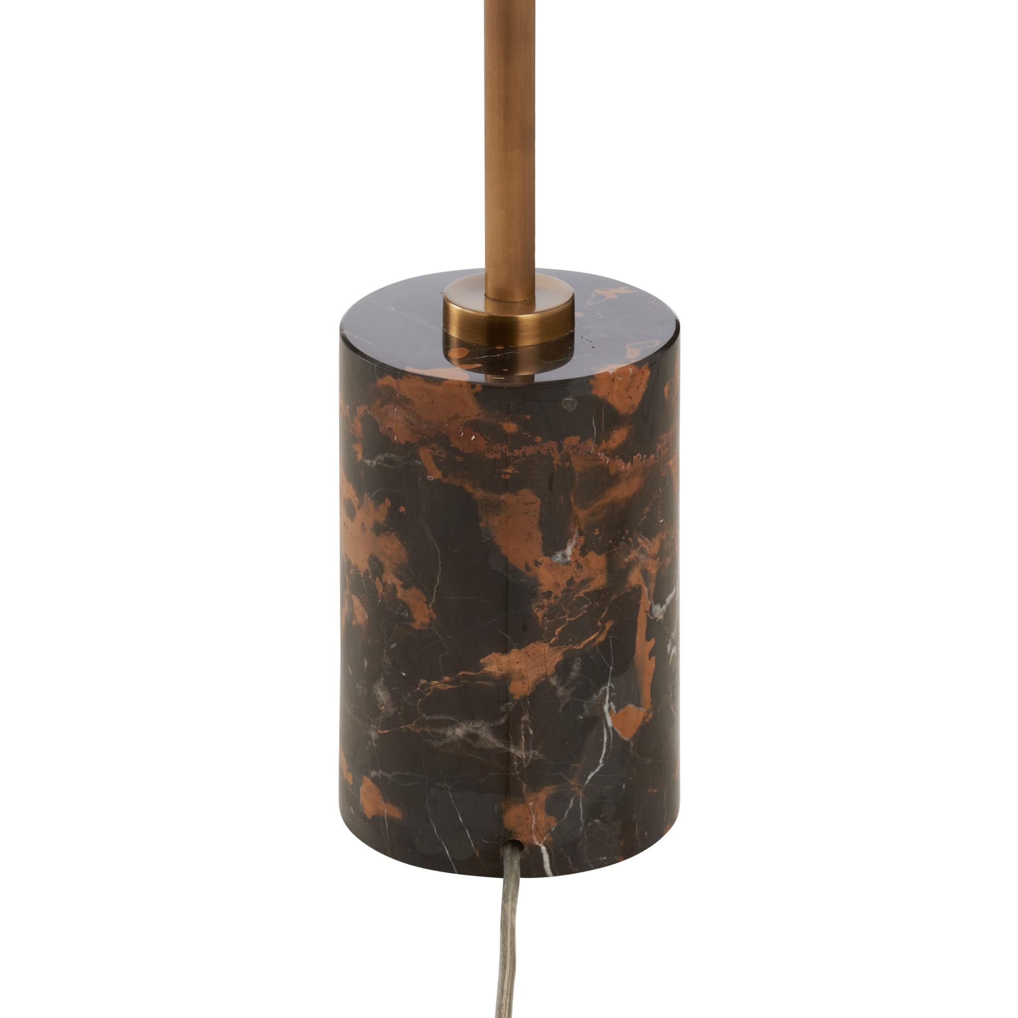 This contemporary floor lamp features a brown marble base with natural veining, accented by a sleek metal body in a rich gold finish. Its minimalist design and refined shade create a warm, elegant glow, blending modern style with timeless luxury. Designed by Jamie Merida.