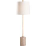 This contemporary lamp features a travertine base accented by a sleek metal body in a rich gold finish. Its minimalist design and refined shade create a warm, elegant glow, blending modern style with timeless luxury. Designed by Jamie Merida.