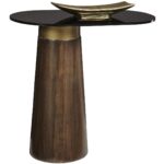 Defined by its fabulous form, this stunning end table features an unconventional shape that will captivate any space. Crafted with a black glass top and a dark brown concrete base with a timber effect. A powder coated brass metal rim completes the look. Crafted from a natural concrete mix, each piece will look different. Variations in colour, texture, imperfections, surface scratches and non-structural hairline cracks are considered inherent and valued qualities of the material.