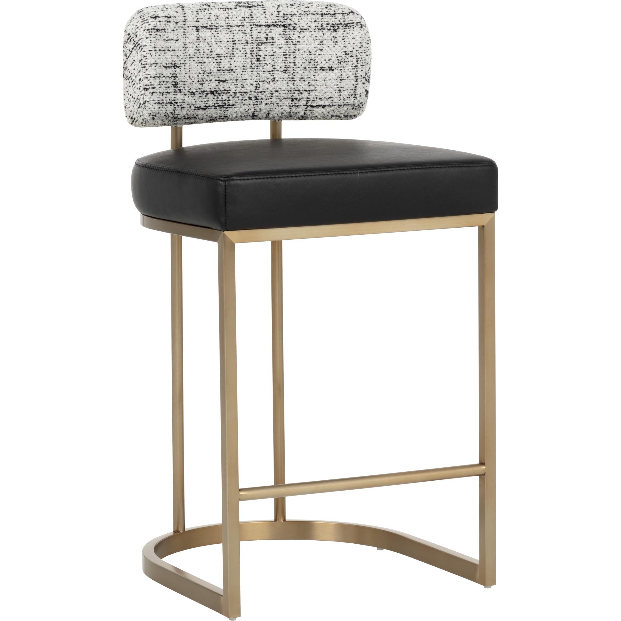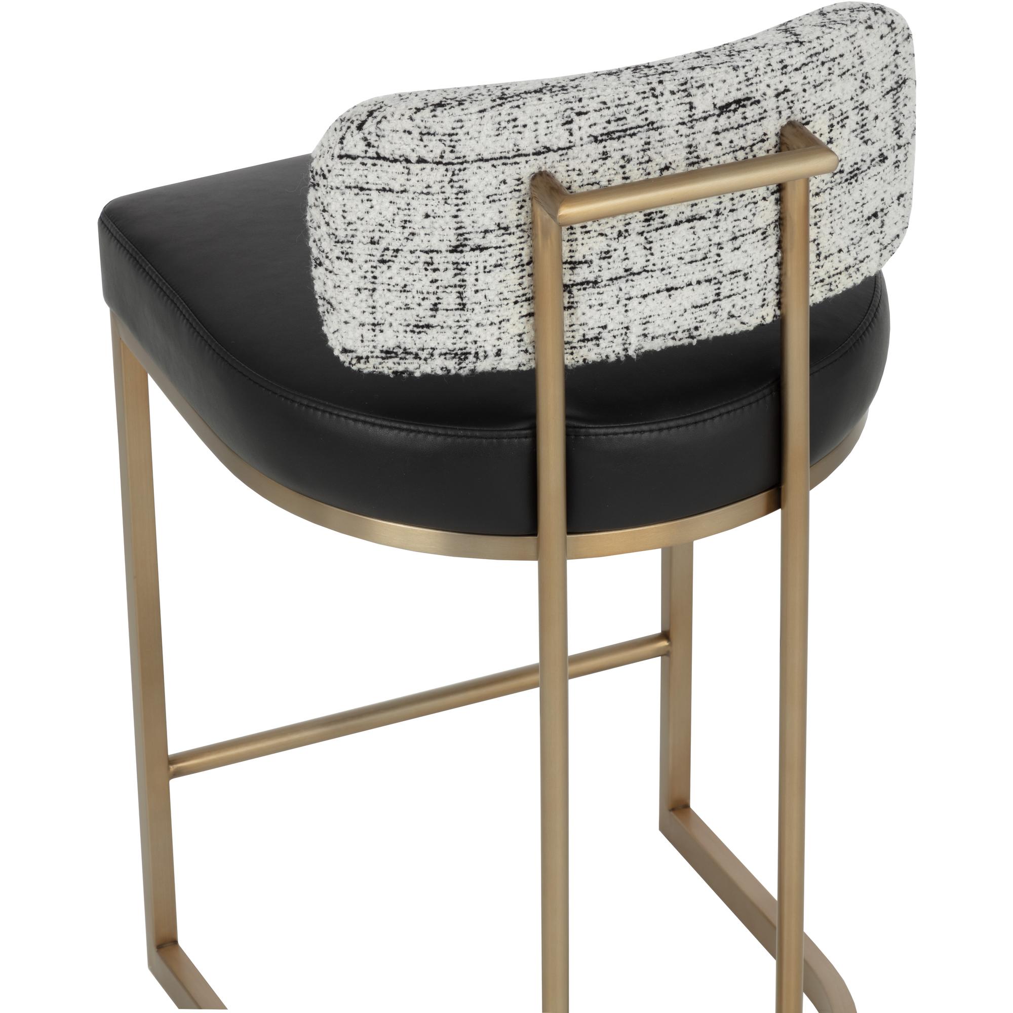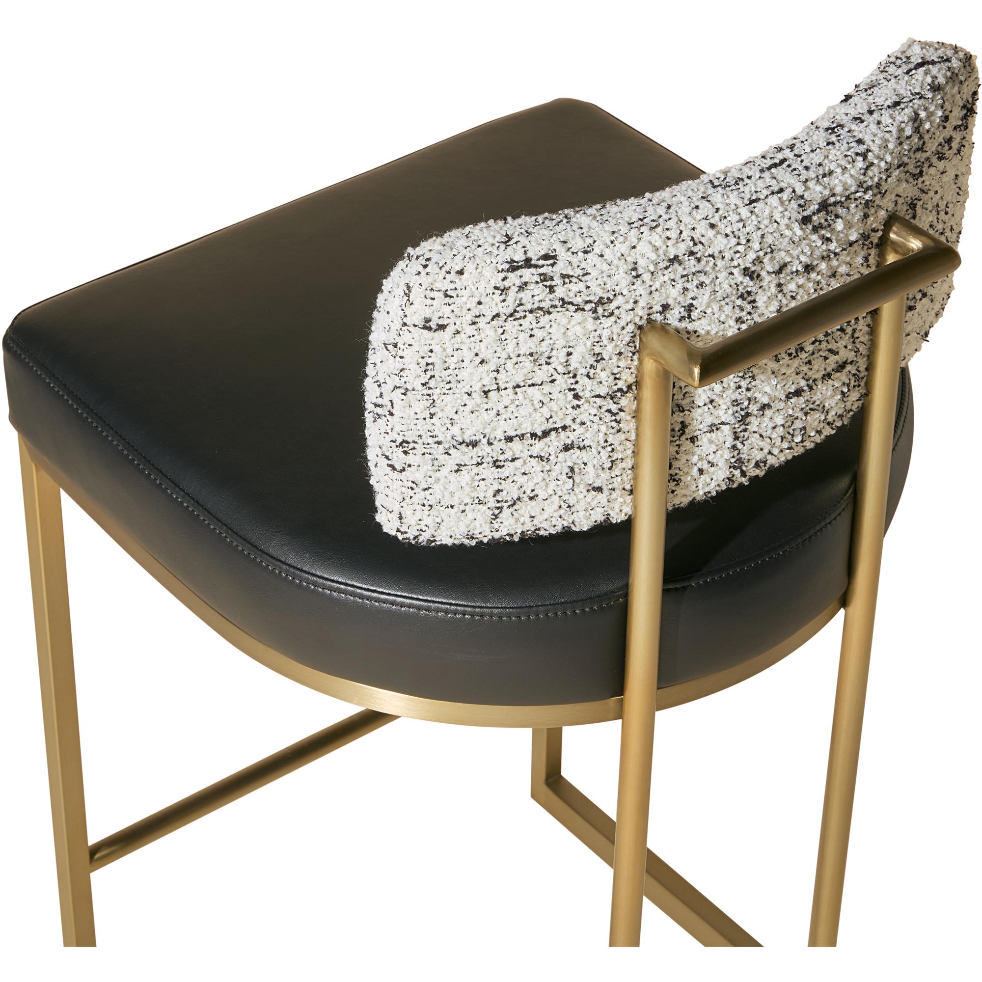 The Larissa Counter Stool brings together a beautiful display of mixed materials. A low seatback upholstered in halton birch fabric contrasts the dark tones of the seat upholstered in bravo black faux leather for an elevated aesthetic. The antique brass stainless steel frame features a handle on the back for a functional and stylish addition.