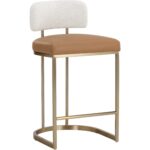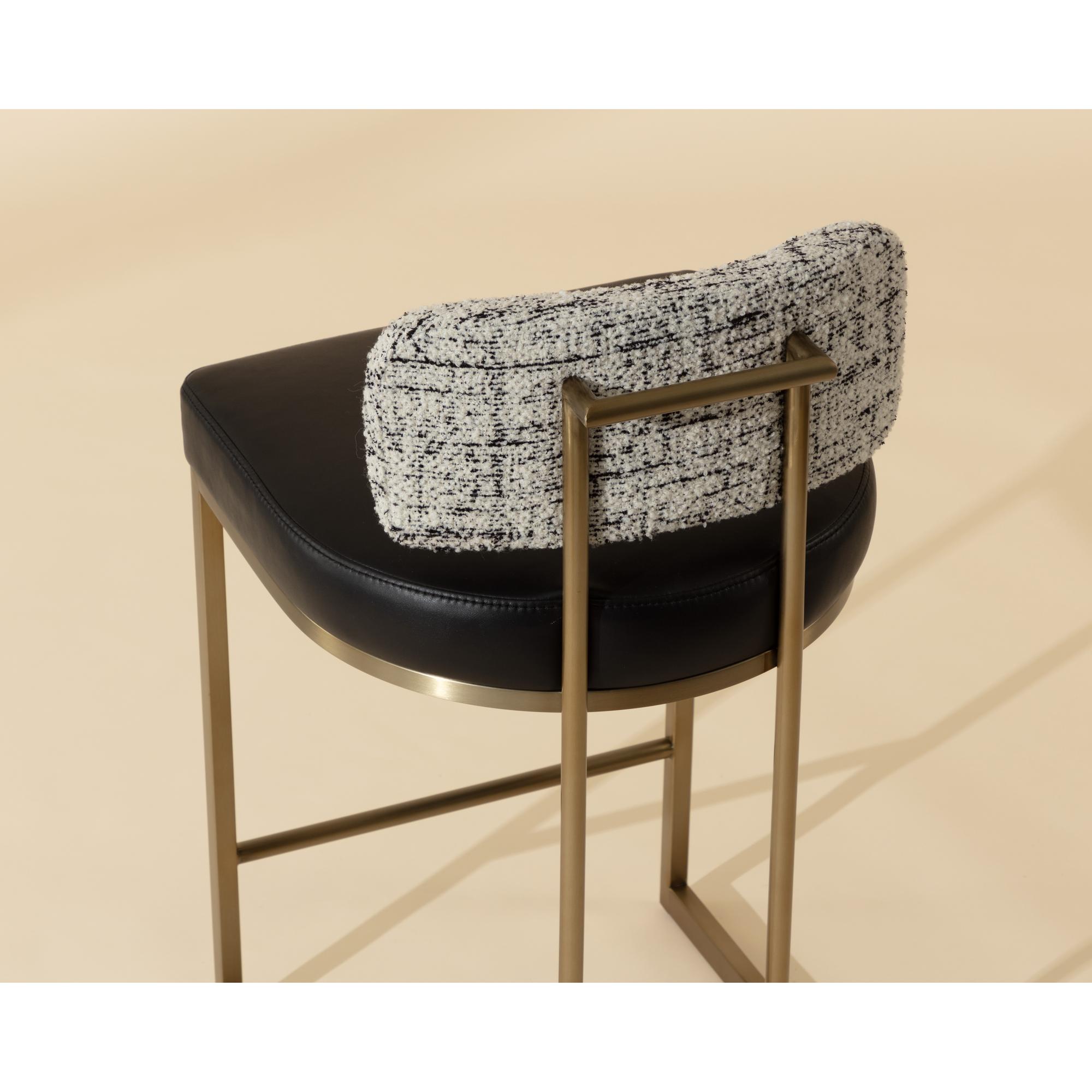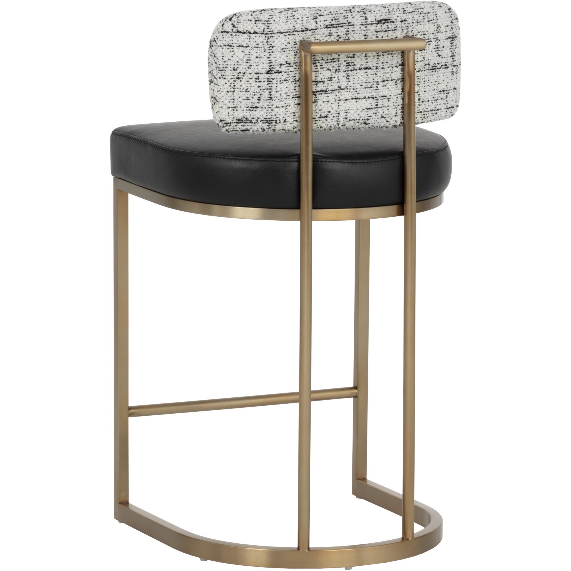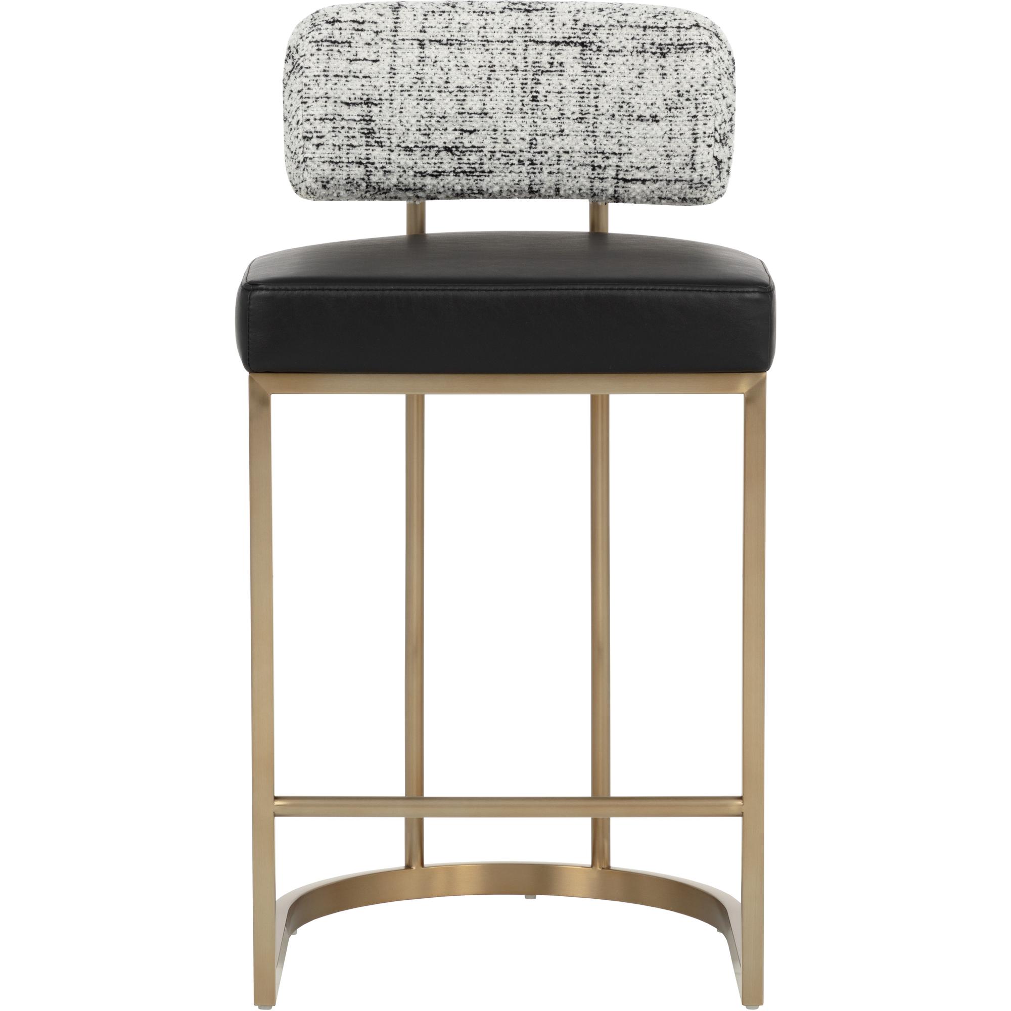 The Larissa Counter Stool brings together a beautiful display of mixed materials. A low seatback upholstered in halton birch fabric contrasts the dark tones of the seat upholstered in bravo black faux leather for an elevated aesthetic. The antique brass stainless steel frame features a handle on the back for a functional and stylish addition.