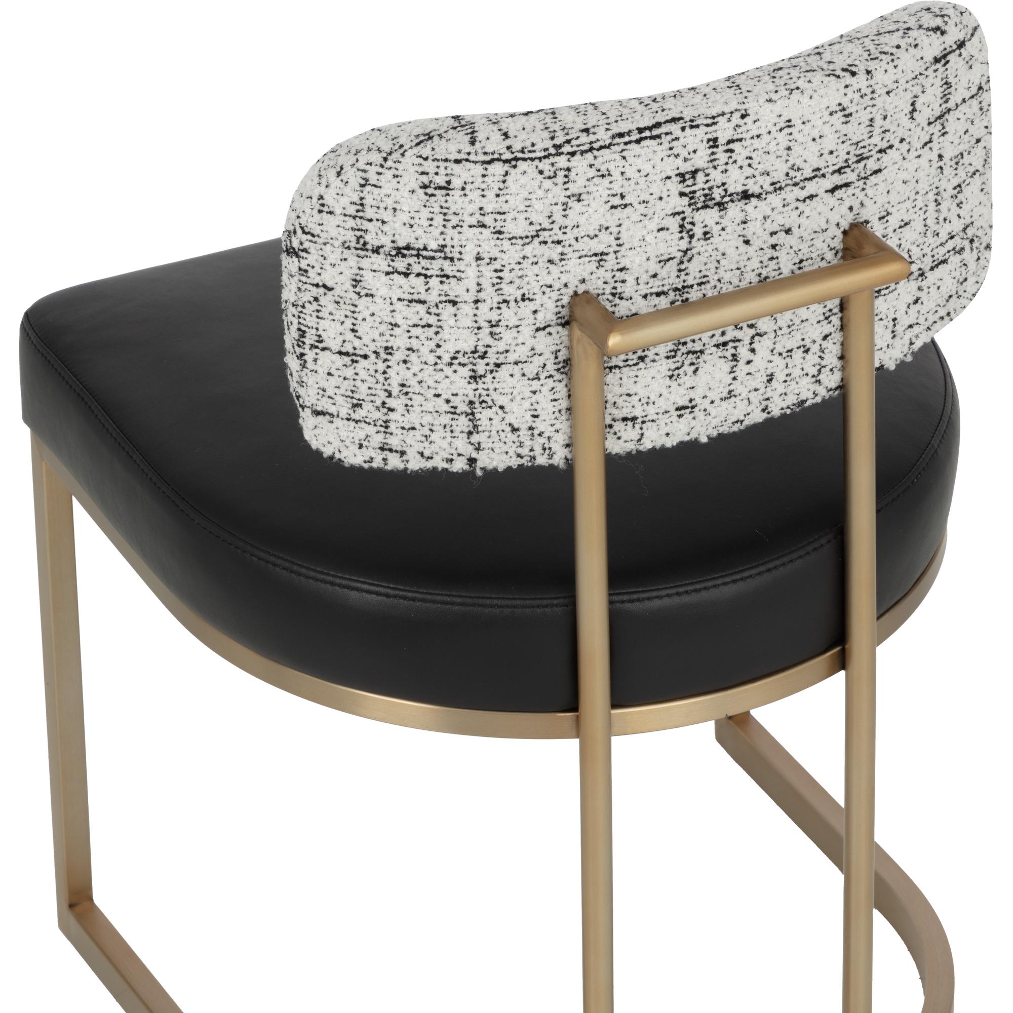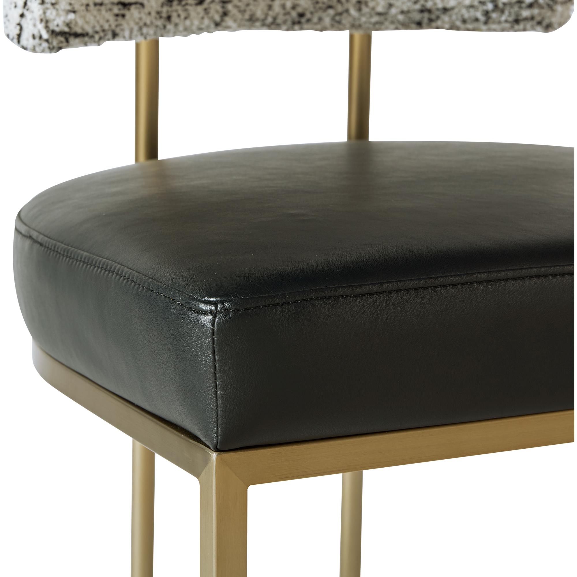 The Larissa Dining Chair brings together a beautiful display of mixed materials. A low seatback upholstered in halton birch fabric contrasts the dark tones of the seat upholstered in bravo black faux leather for an elevated aesthetic. The antique brass stainless steel frame features a handle on the back for a functional and stylish addition.