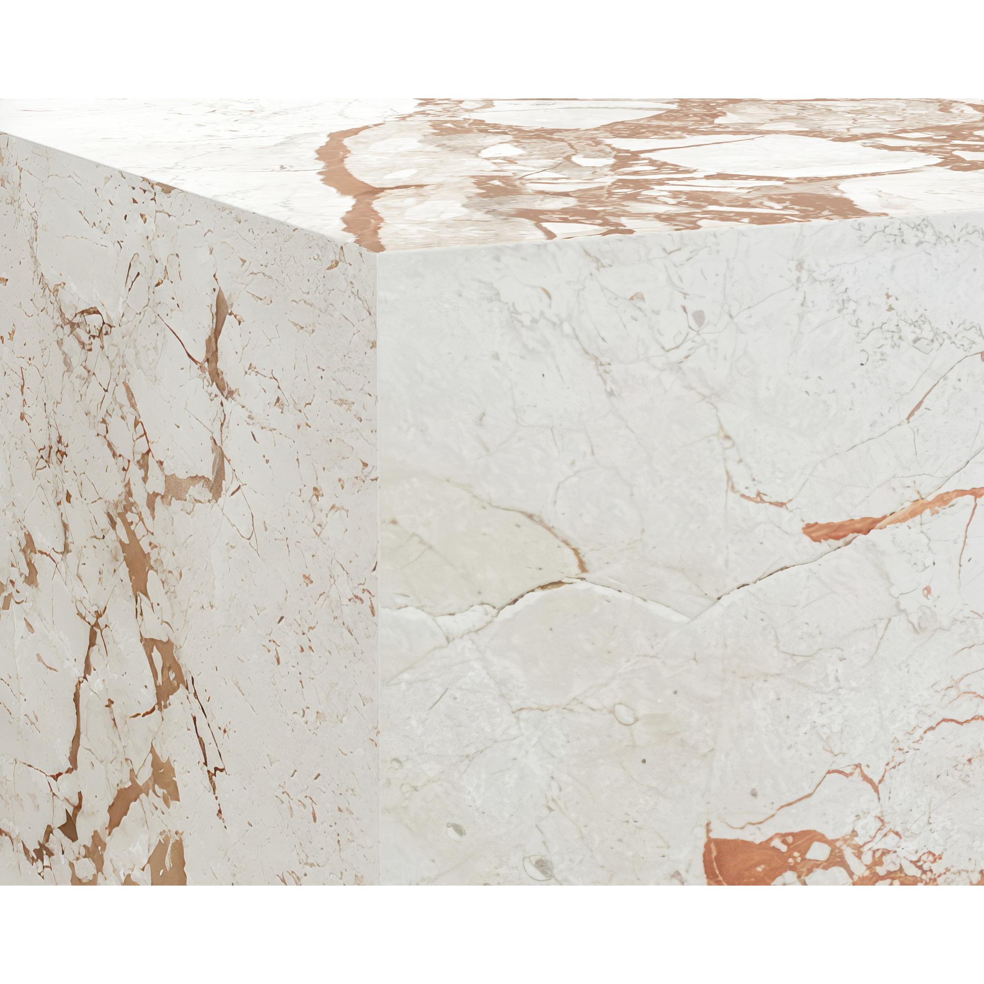 The Laros End Table showcases the raw beauty of marble, with rich veining and subtle variations unique to each piece. Its bold cube form is compact yet striking, adding texture and elegance to any space whether placed beside a sofa or as a standalone accent.
