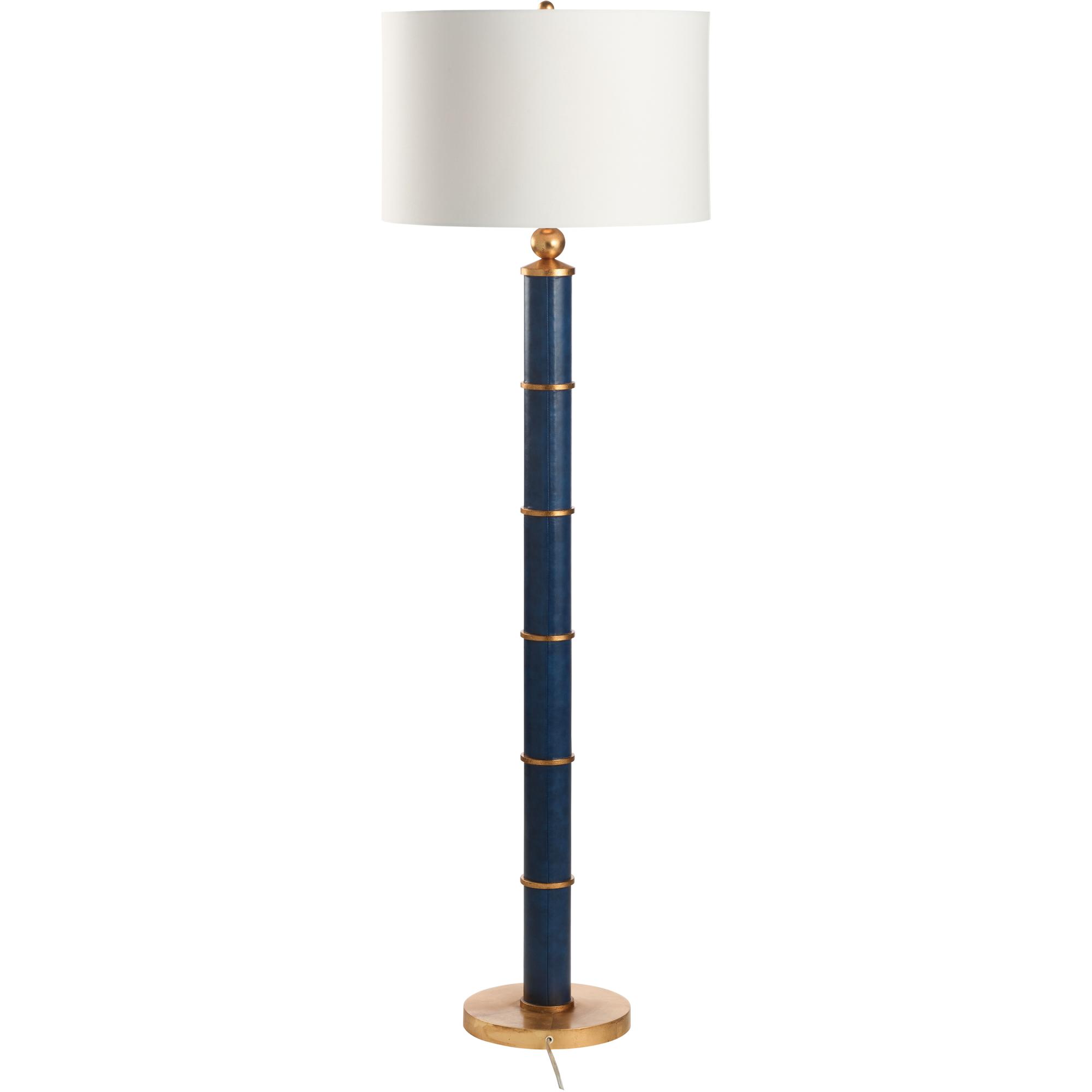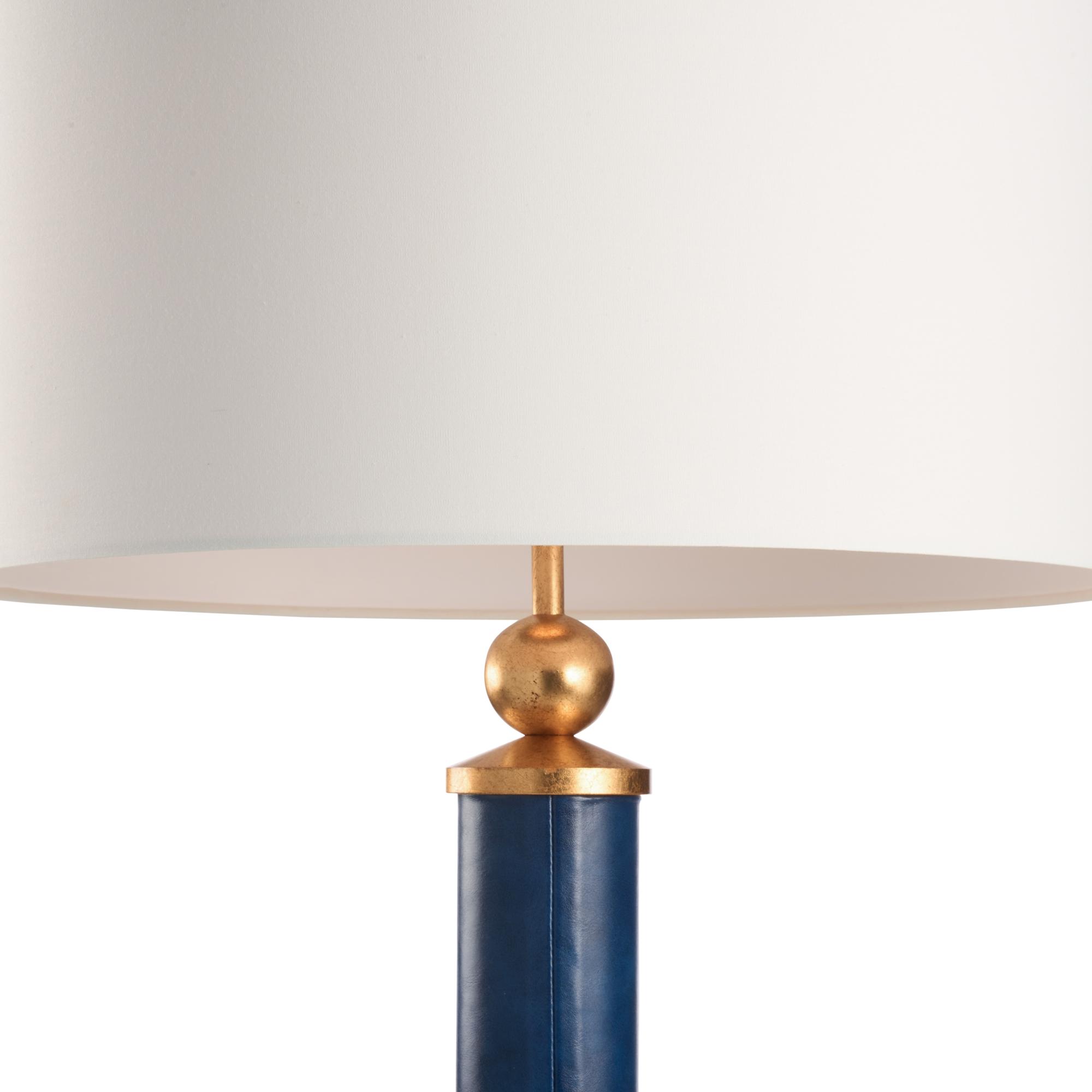 This navy leather floor lamp exudes handsome sophistication, featuring rich leather wrapped around the body and adorned with elegant gold accent bands. A polished gold ball detail adds a refined touch, blending modern luxury with timeless style. It’s a striking statement piece that elevates any interior with its bold, tailored presence.