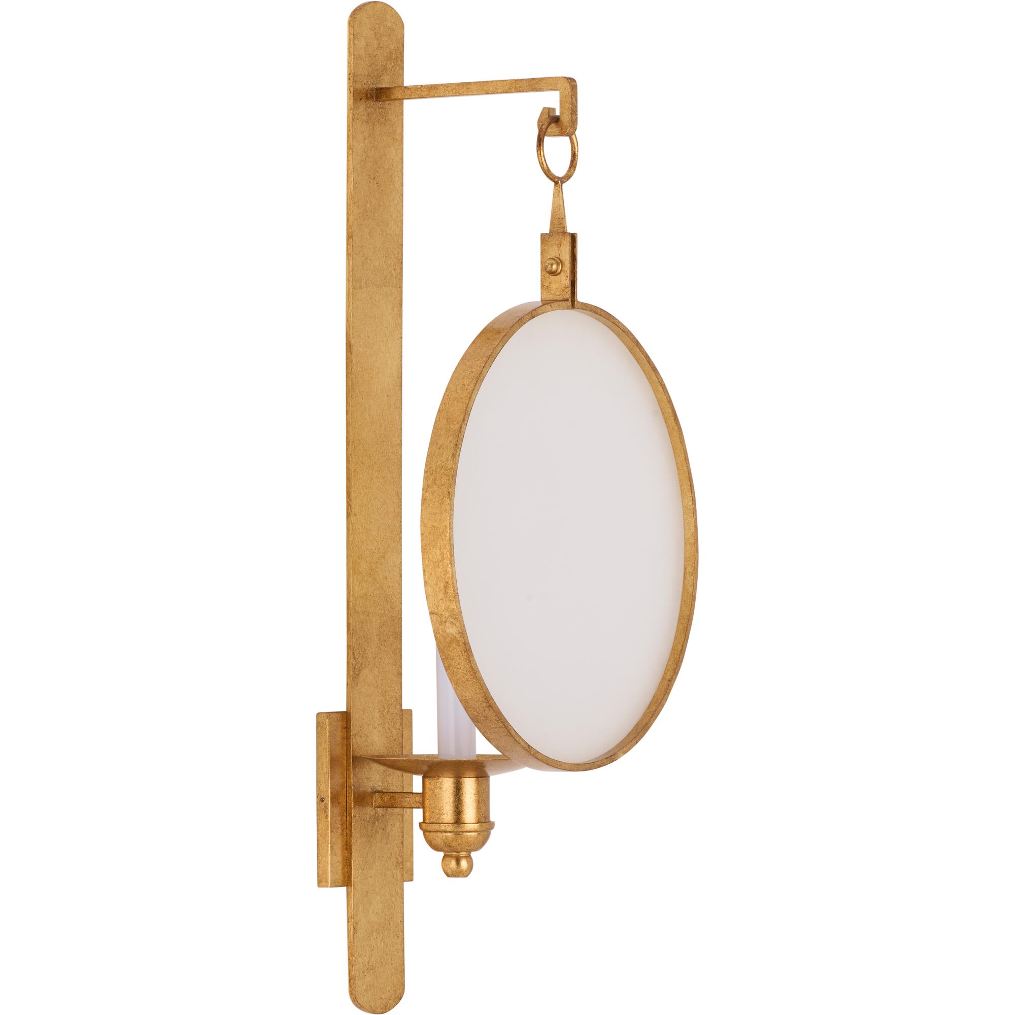Add warmth and style to your walls with Leggit Sconce. Featuring a radiant antique gold leaf finished iron supporting a round clear glass shield, this hanging wall sconce gives depth and dimension to your space. This sconce can be used to give a soft glow over a console in a foyer or a pair can be used to flank a mirror or picture in your living area.