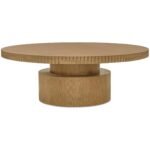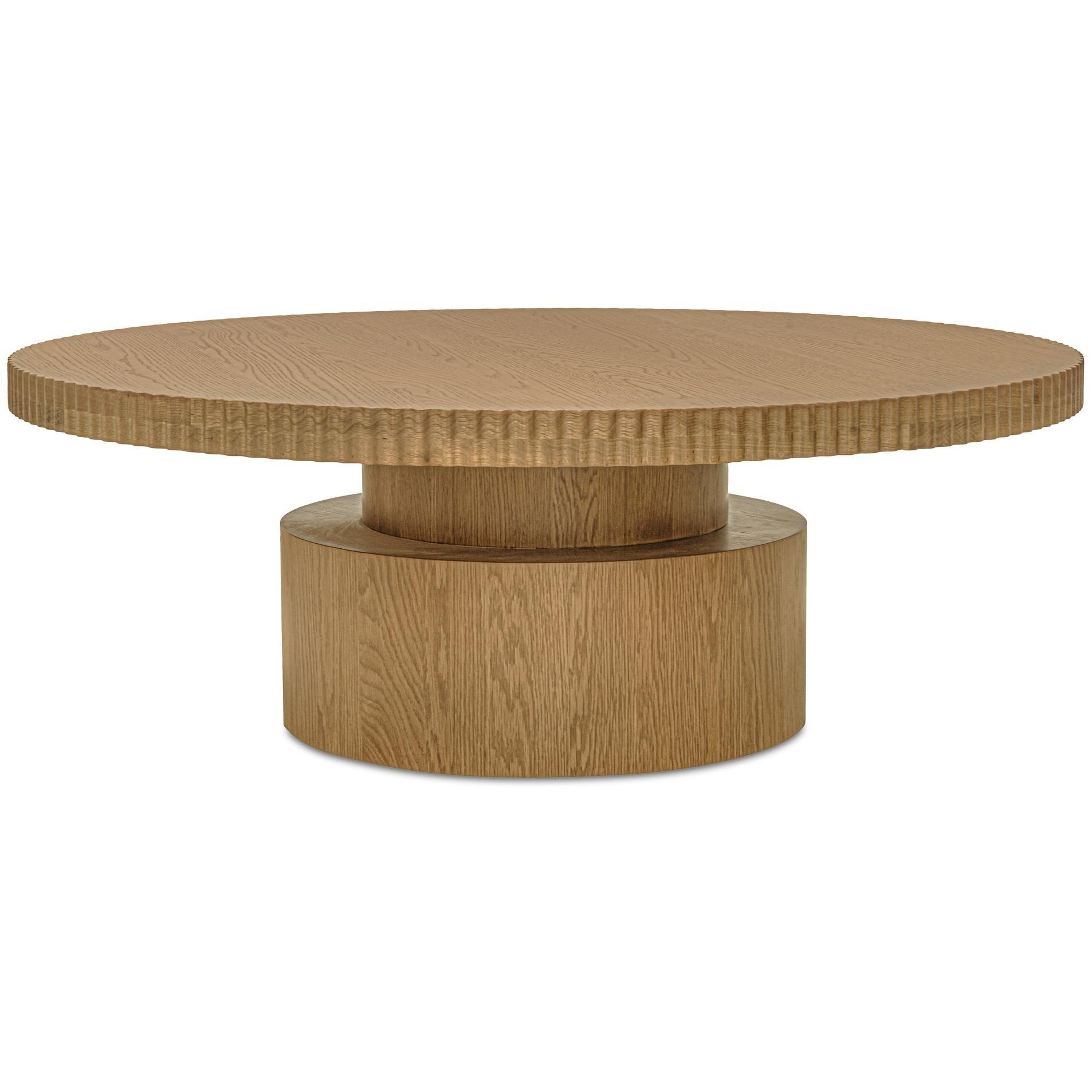 Not your average coffee table. Leigh makes a bold statement with a thick, round table top edged in a playful scalloped detail. Its stacked cylindrical base balances lightness with grounding presence, finished in oak veneer over MDF with a solid oak edge. Built for everyday living