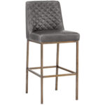 Transform bar and dining spaces with this classic barstool. Stocked in coal black faux leather with diamond stitching on the interior seat back and an antique brass frame steel frame. Suitable for various dining, kitchen and bar spaces of all sizes. Handle With Care: This design has been crafted with faux leather. Faux leather is manufactured to reflect the natural characteristics of leather; as such, colour variations, markings, wrinkles, grooves, and light scratches are appreciated characteristics. No two pieces will be alike. Visit our Product Care page for more information on how to ensure the lasting beauty of this piece.