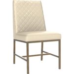 Invigorate dining spaces with this classic dining chair. Features beautiful diamond stitching on the interior seat back and an antique brass frame steel frame. Stocked in dark grey fabric.