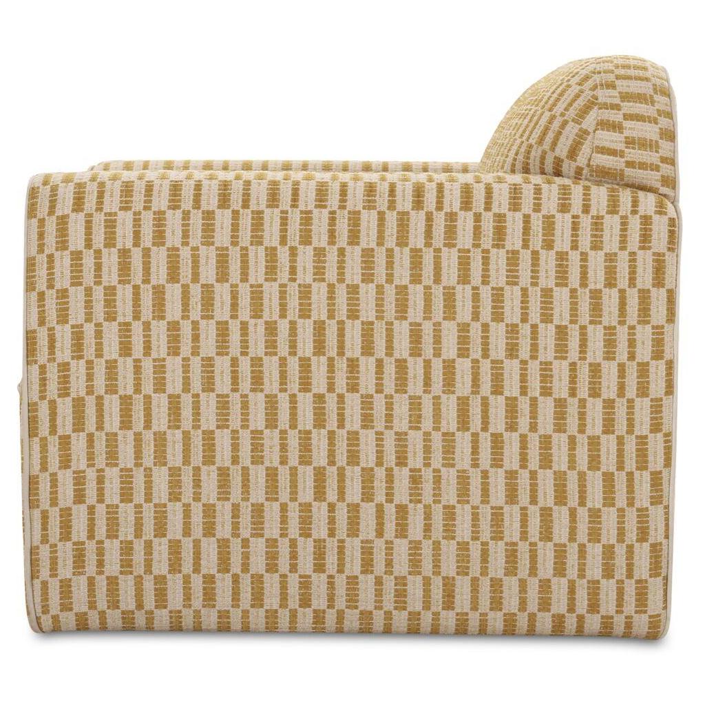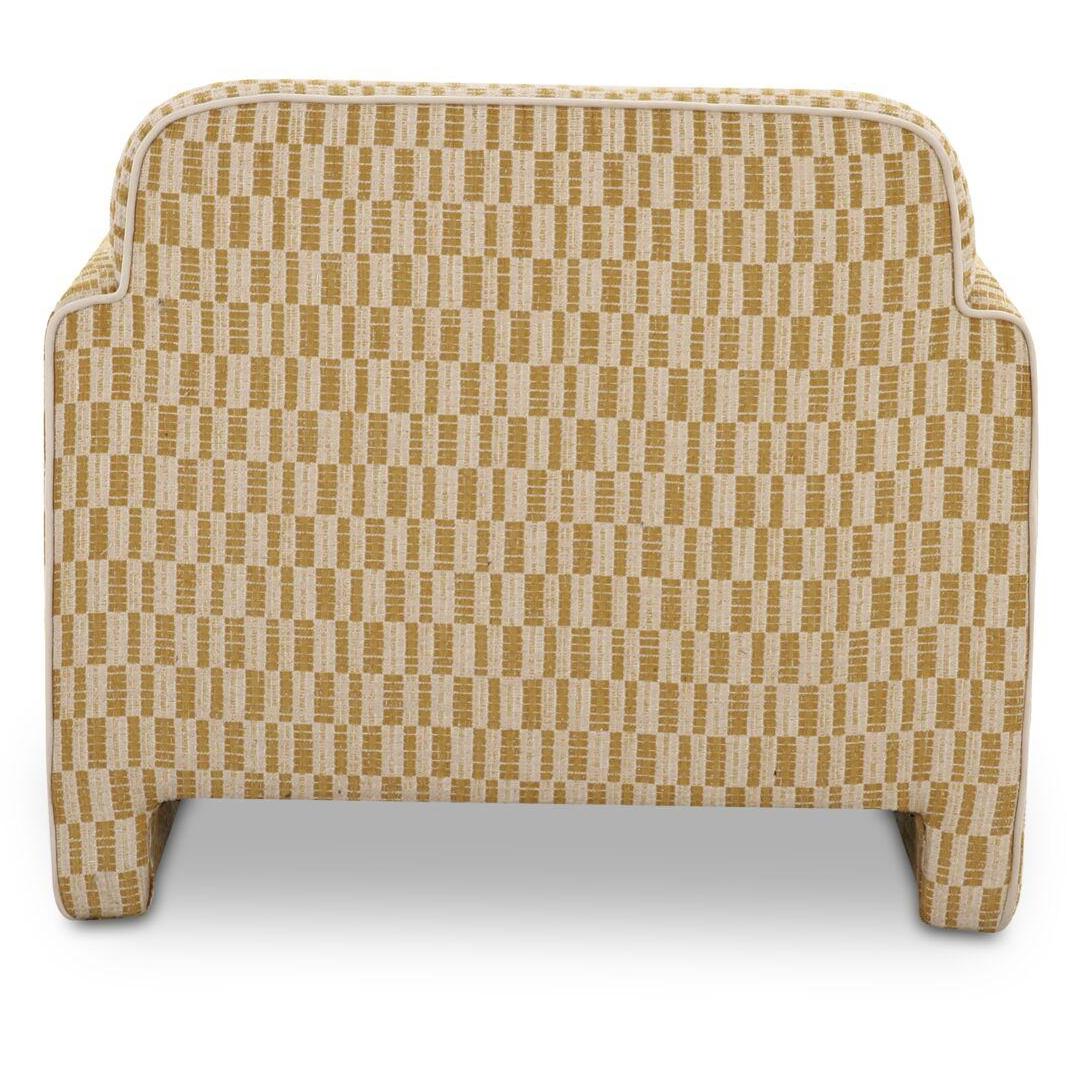 - Geometric pattern with tonal contrast piping & inward rolled arm detail