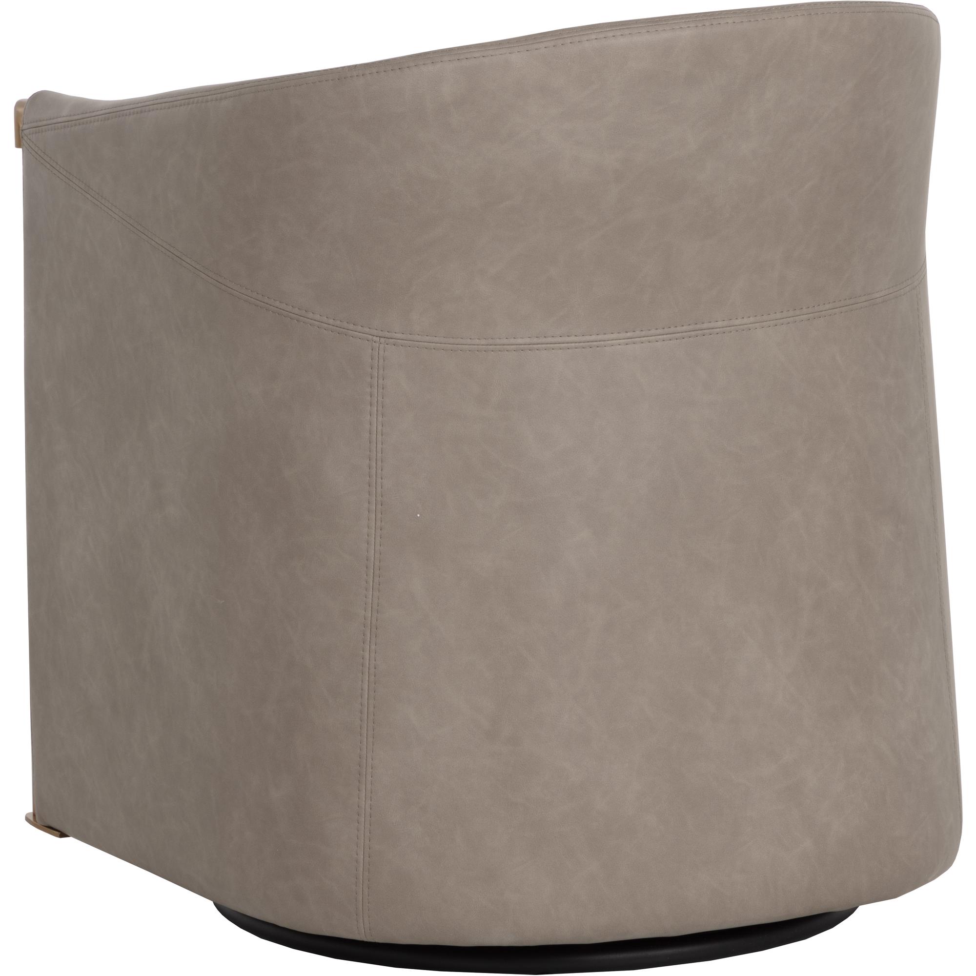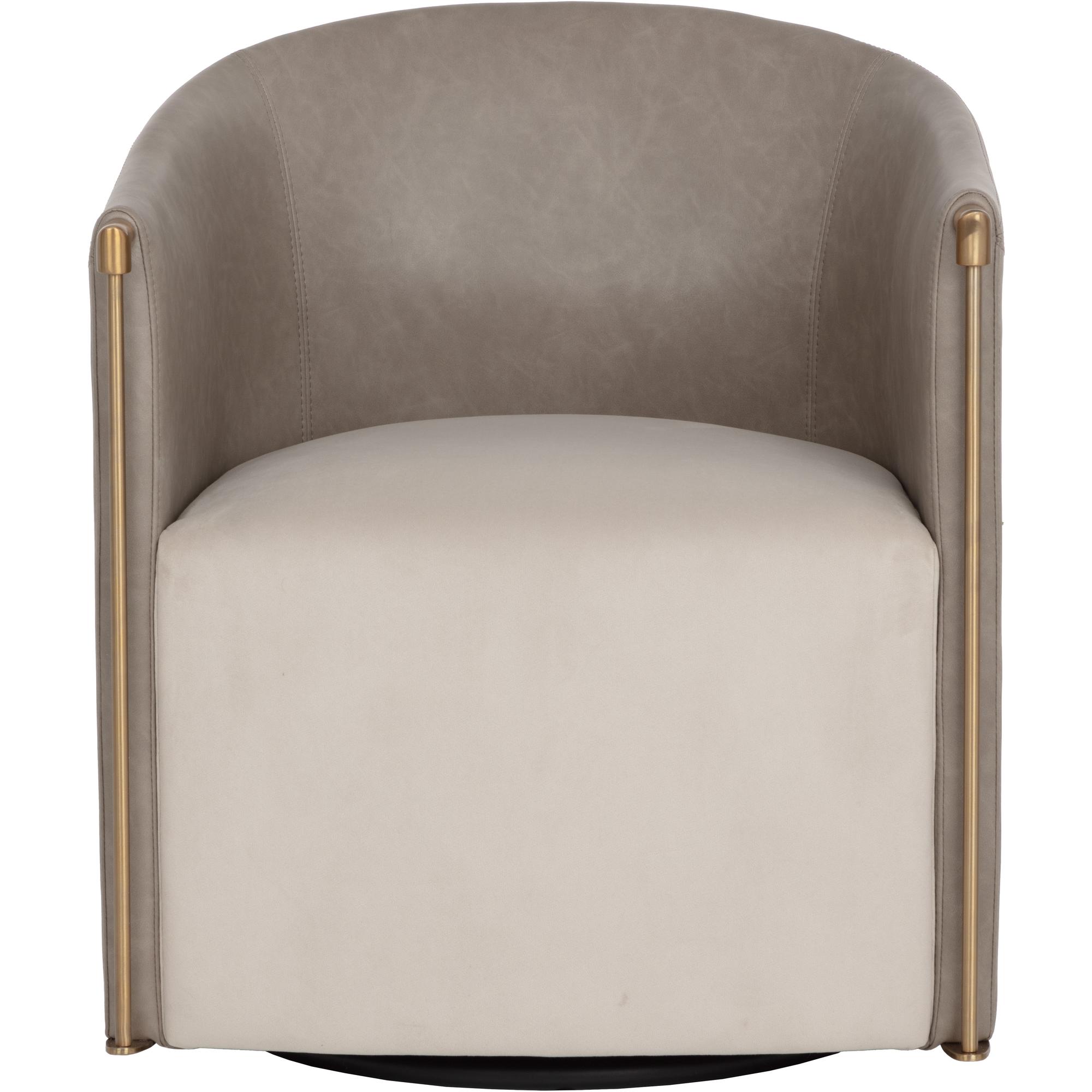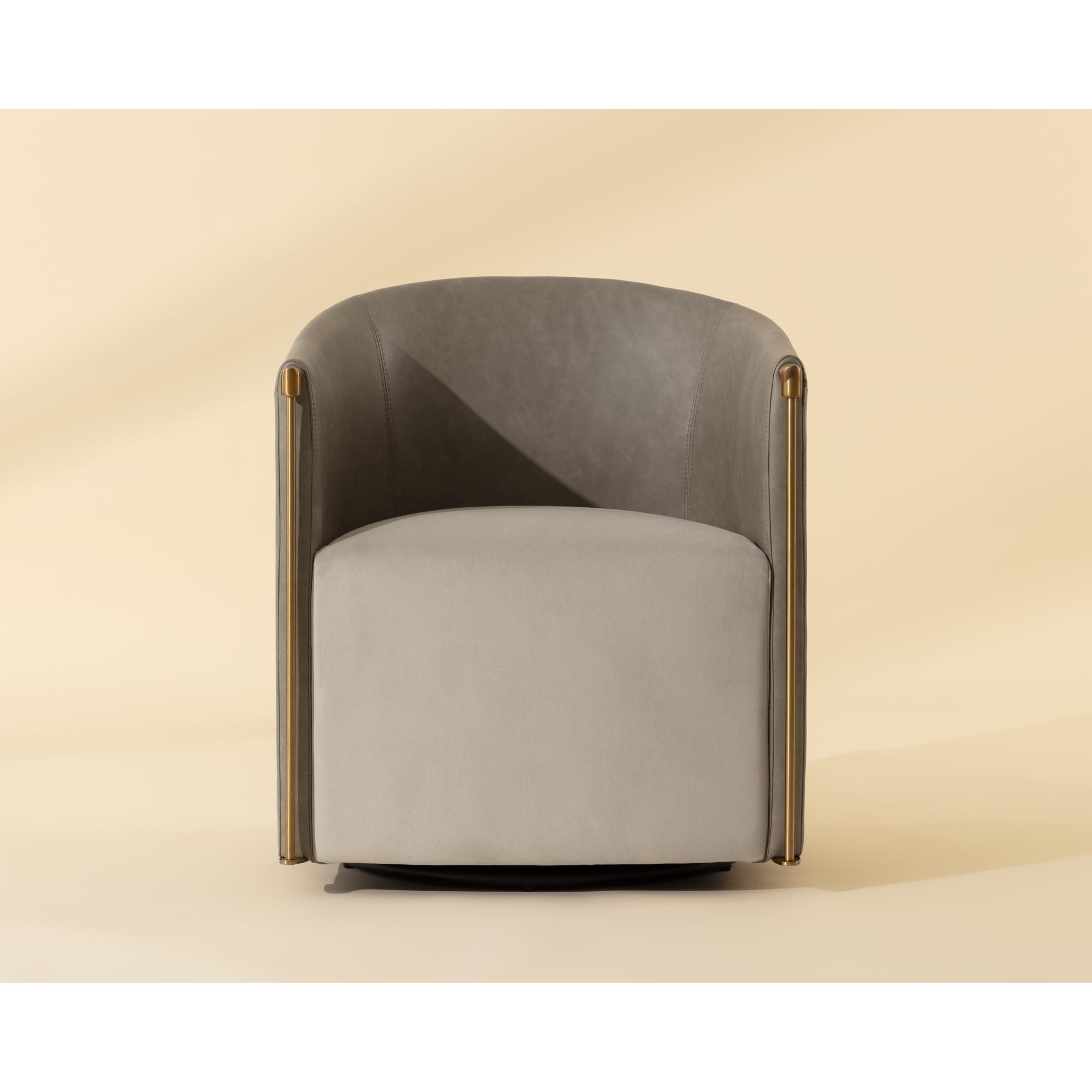 The Leontine Swivel Lounge Chair features a barrel-back design wrapped in smooth ivanhoe mineral faux leather, with exposed stitching accentuating gentle curves and enveloping comfort. A soft meg taupe fabric seat cushion gives the seat a tonal contrast, while slim powder-coated stainless steel arms bring a crisp, modern line to the silhouette. A composed yet effortless addition to a living or dining space.