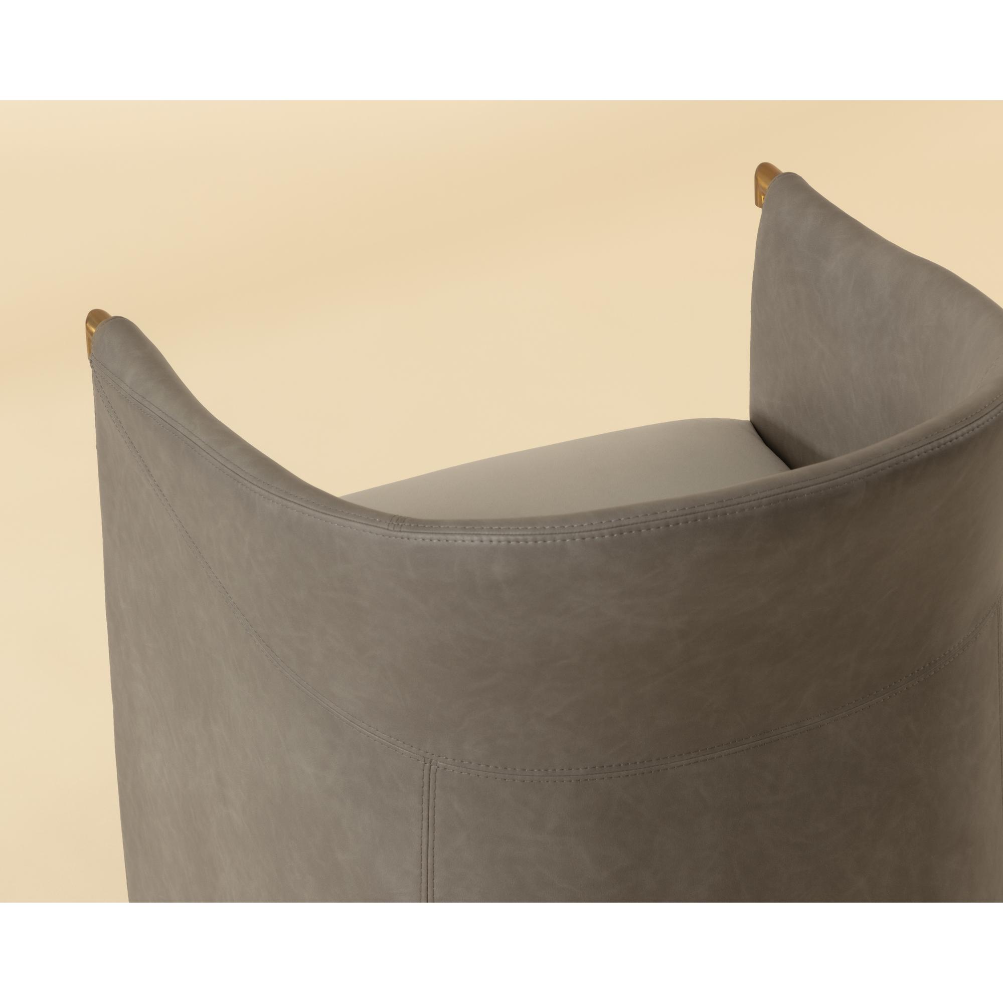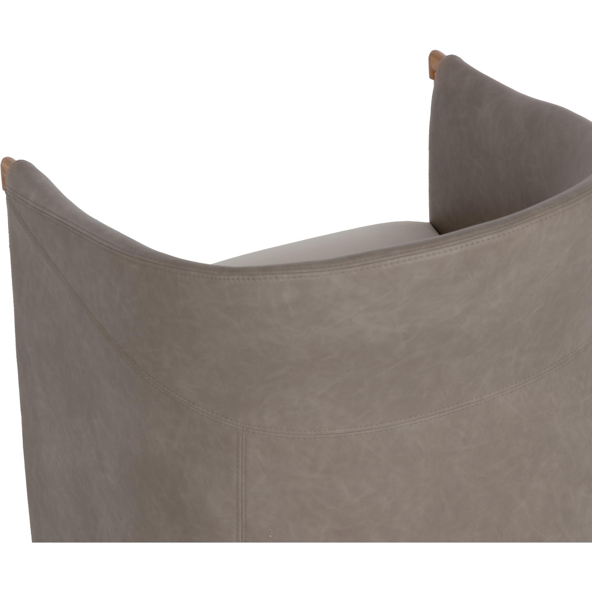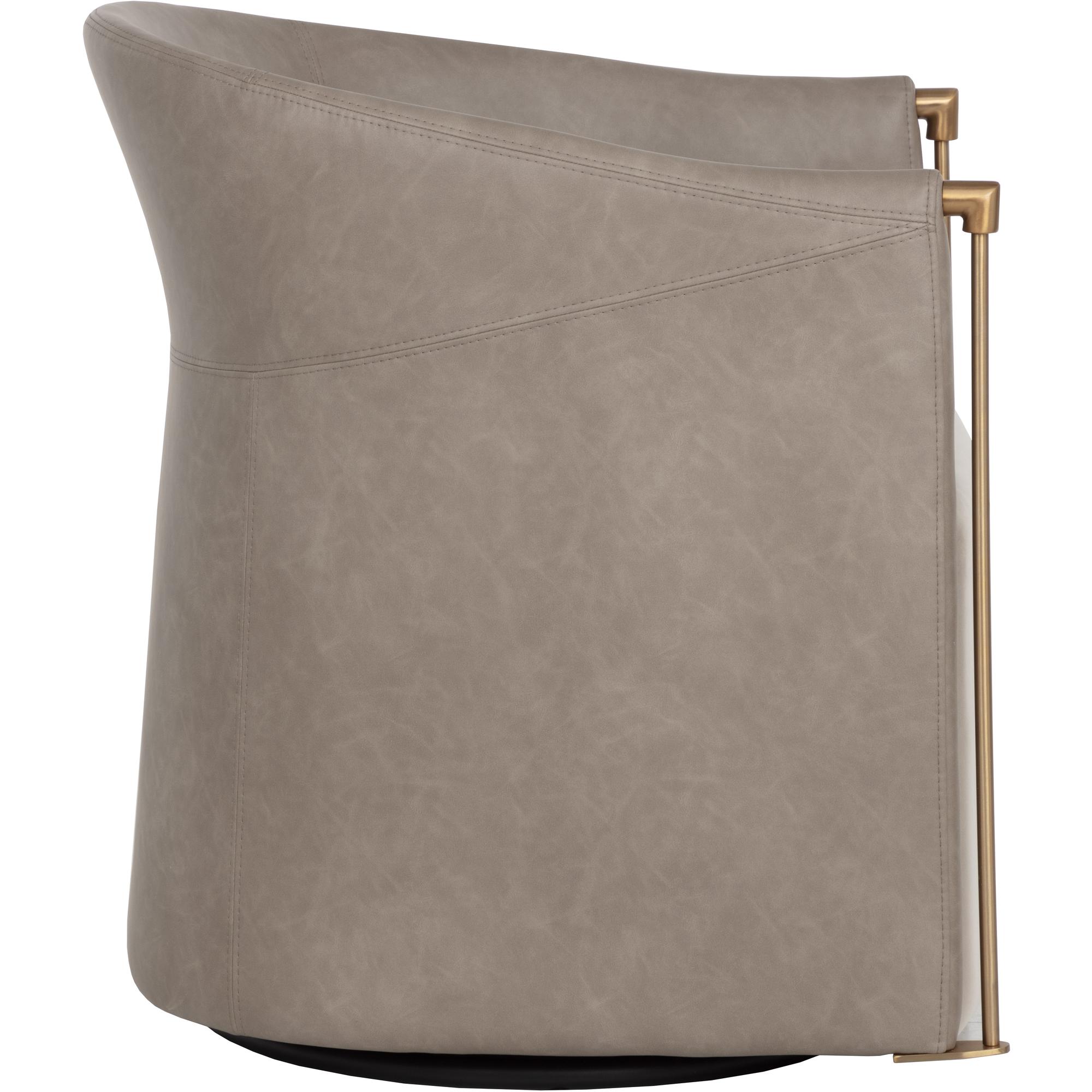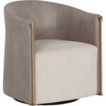 The Leontine Swivel Lounge Chair features a barrel-back design wrapped in smooth ivanhoe mineral faux leather, with exposed stitching accentuating gentle curves and enveloping comfort. A soft meg taupe fabric seat cushion gives the seat a tonal contrast, while slim powder-coated stainless steel arms bring a crisp, modern line to the silhouette. A composed yet effortless addition to a living or dining space.