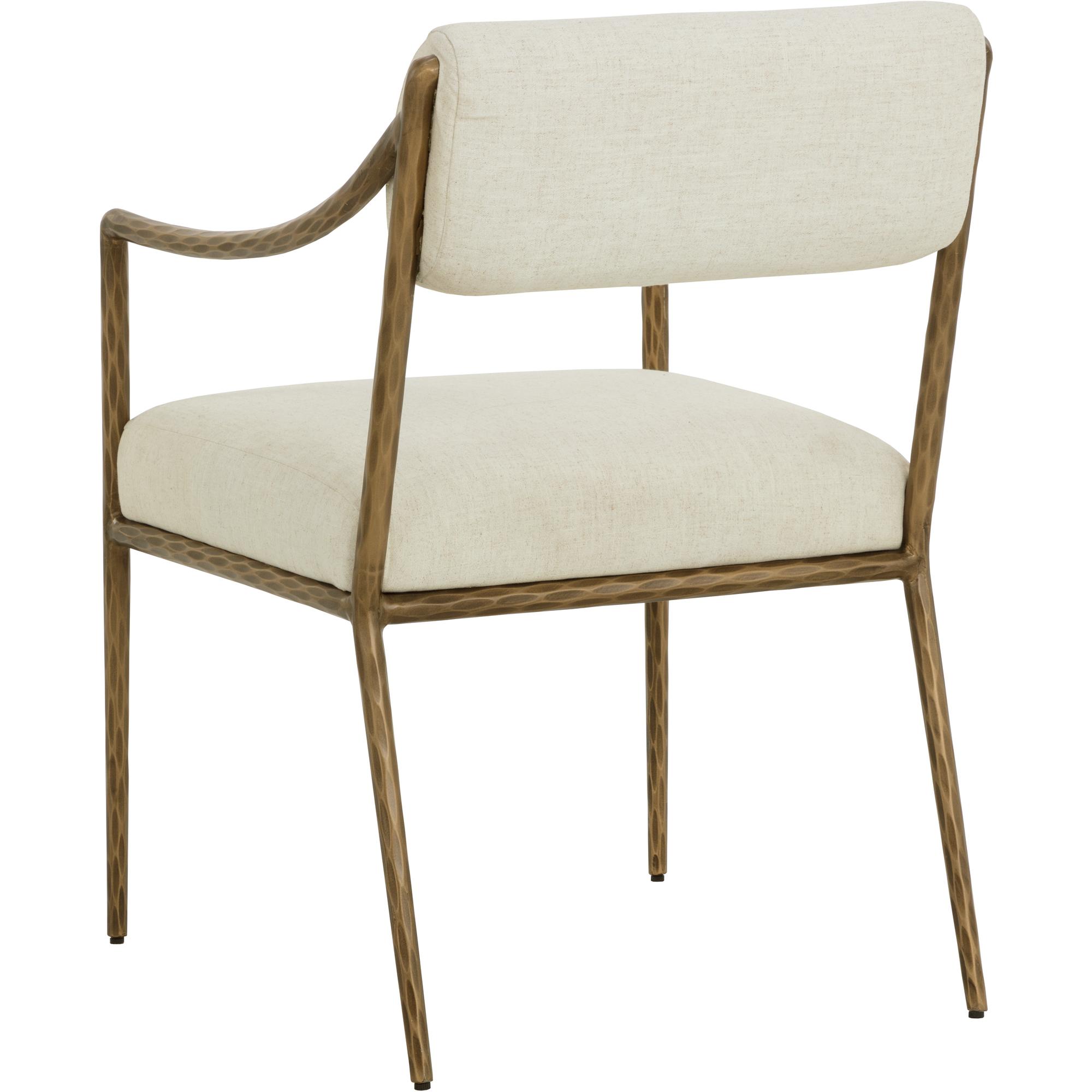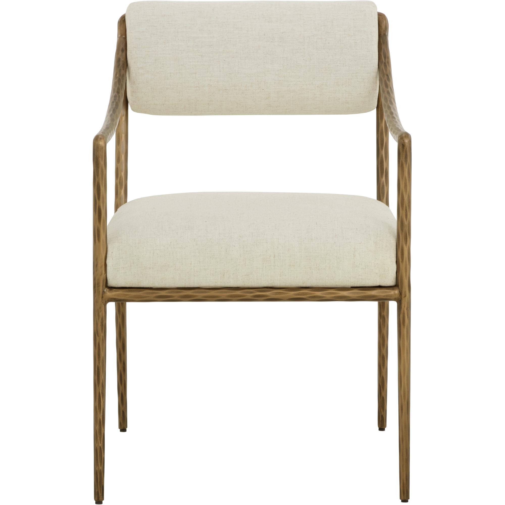 A timeless statement of expert craftsmanship, the Leticia Dining Armchair offers both beauty and resilience. Sloped arms invite ease, while hand-hammered detailing on the tapered metal frame lends an artisanal touch. Upholstered in geralt linen performance fabric, this versatile piece is equally at home at an elegant dinner party or styled as an accent chair.