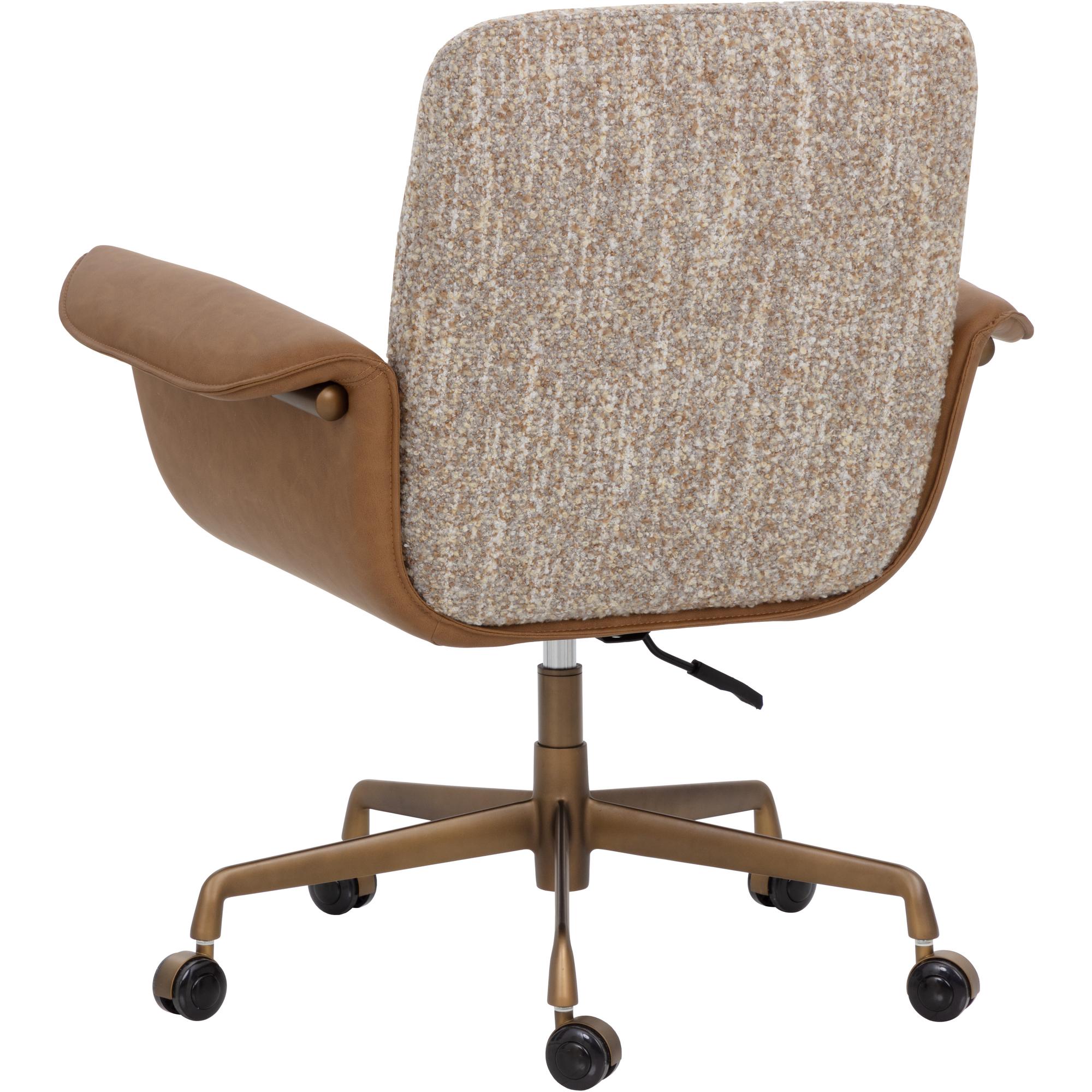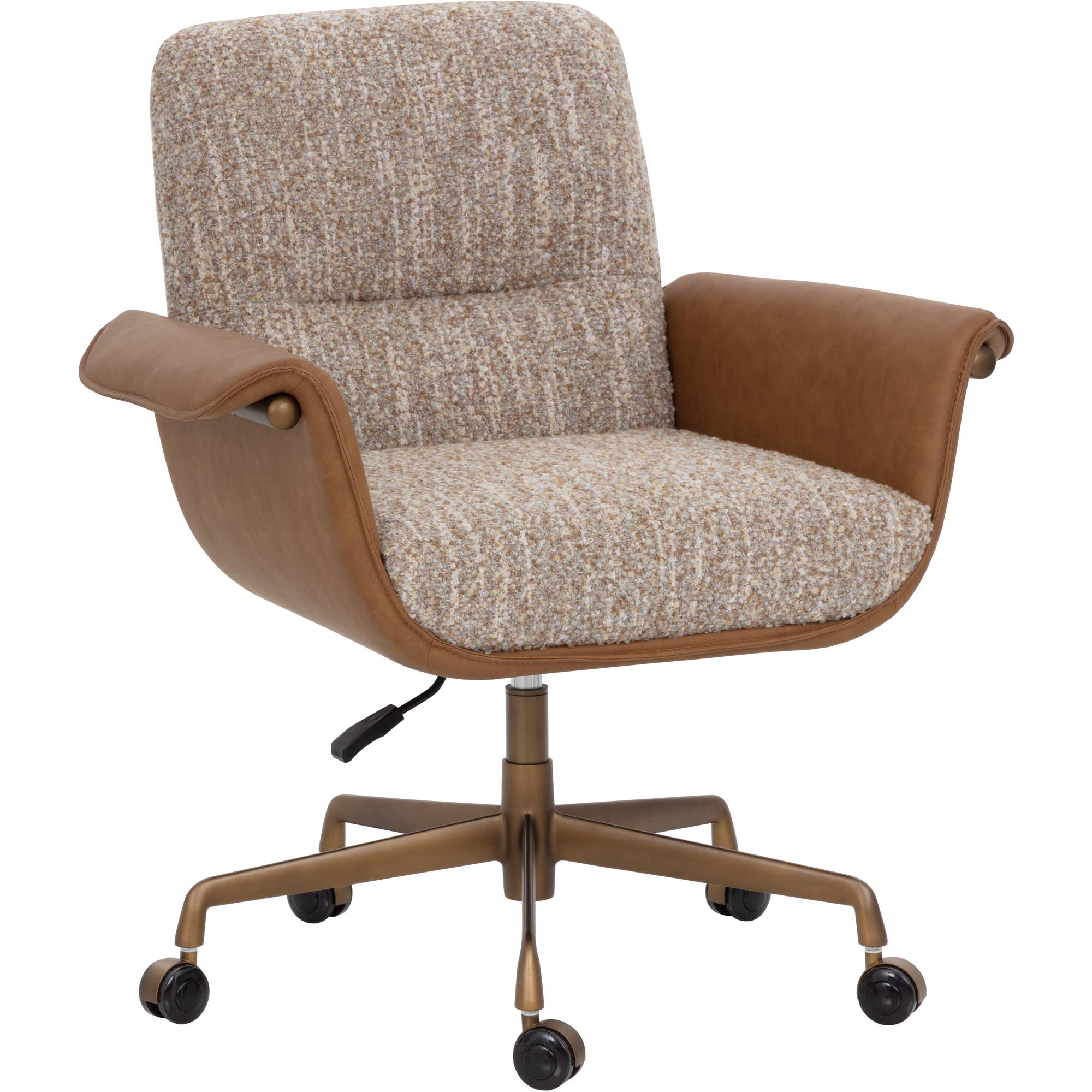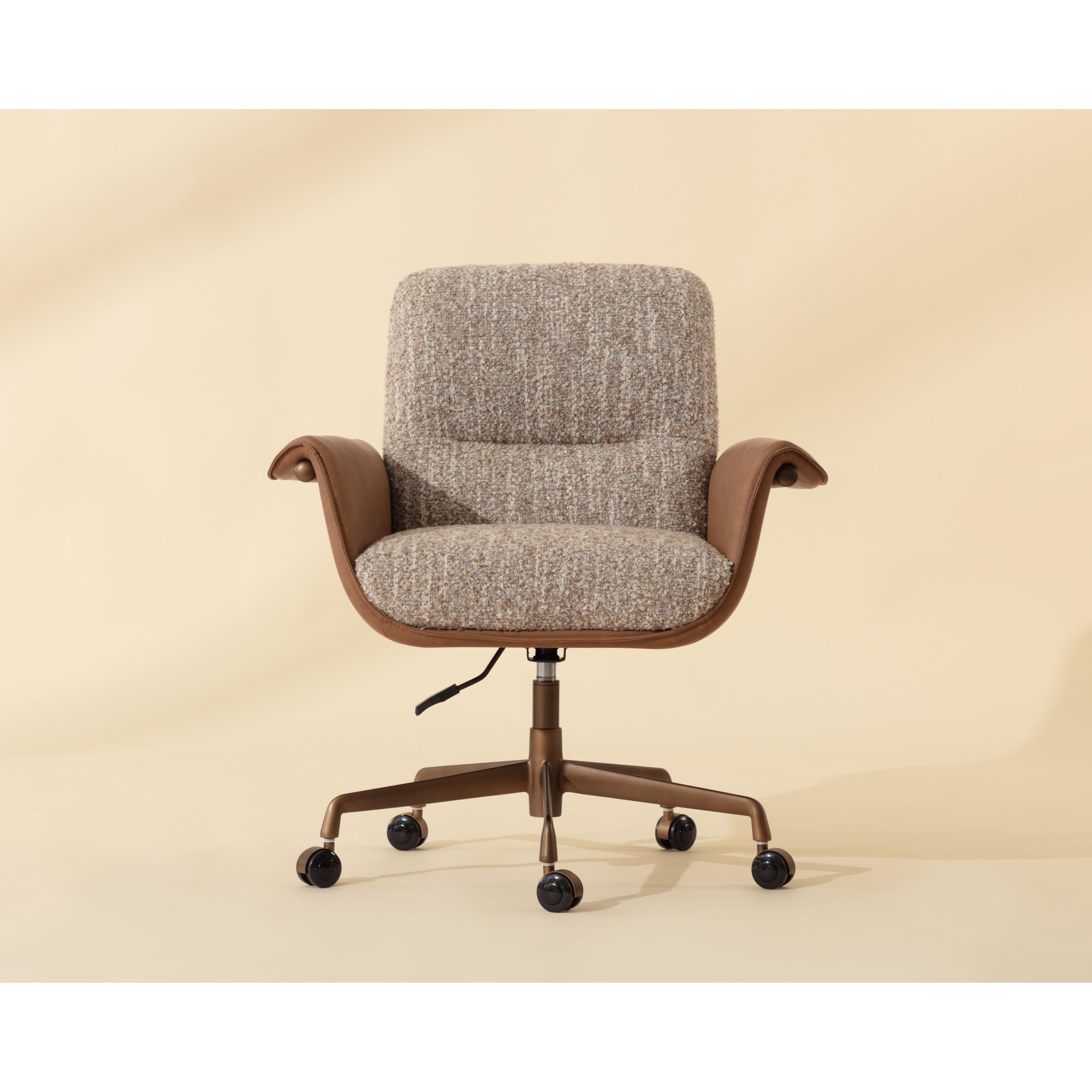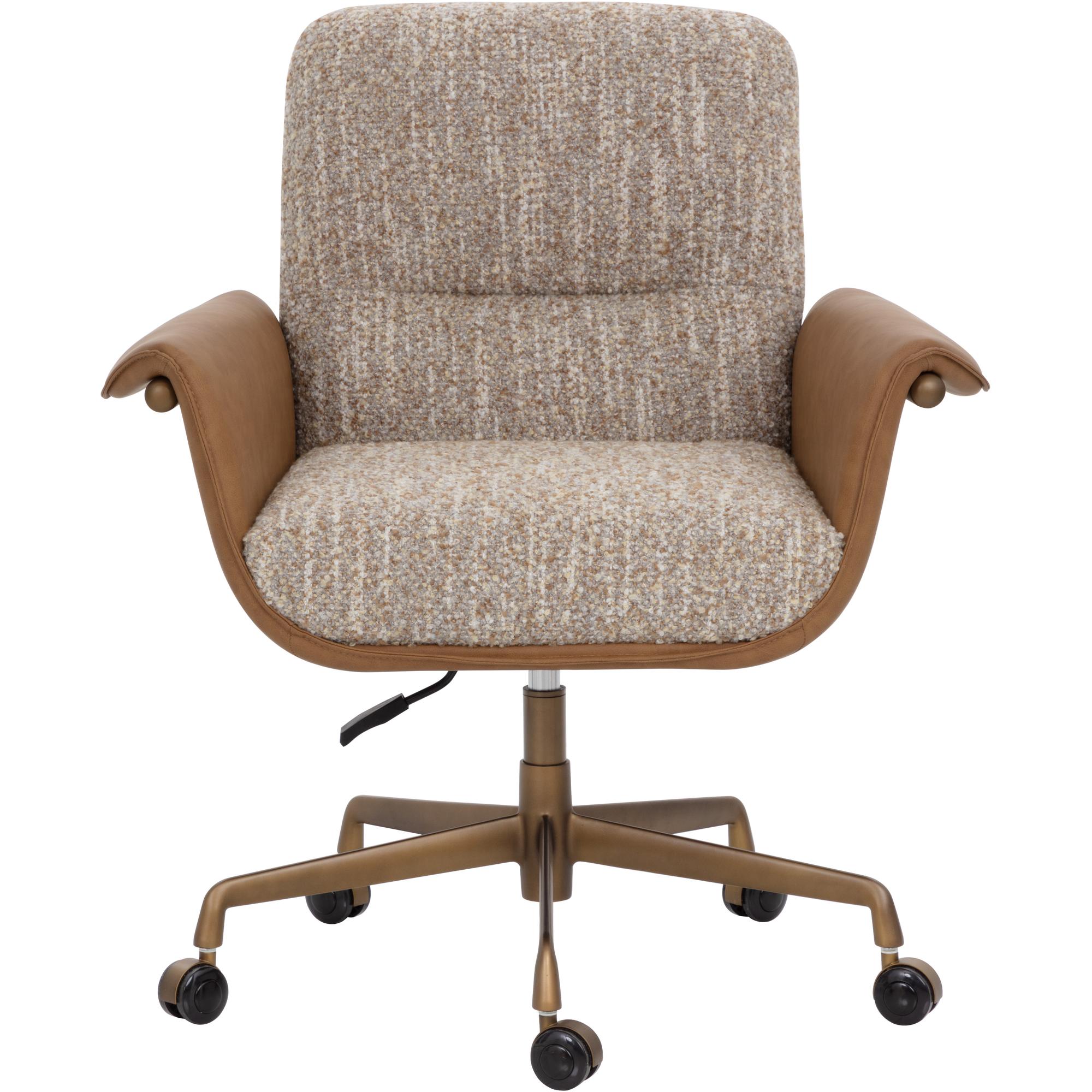 The Lomax Office Chair is a balance of utility and craftsmanship in a two-tone design. The seat and backrest are upholstered in textured dusty greige fabric, framed by metal arms clad in milliken cognac faux leather. The arms fold gracefully over the sides, softening the industrial edge of the structure while emphasizing the layered mix of materials. A rustic bronze steel base completes the design.