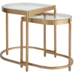 A picturesque pairing, the Editorial End Tables add structural interest to living spaces with two uniquely sized, soft gold metal bases with glass tops, that are perfect for bunching together.