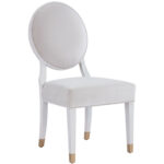 Boasting an exquisite rounded back, an upholstered seat, and soft gold metal caps on each leg, the Love Joy Bliss Oval Side Chair is a luxe seating choice.