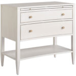 A charming juxtaposition of materials, the Peony Nightstand finds seamless balance between a glass top, soft gold and acrylic bar hardware and a chic White Lacquer finish. For added flair, the legs are also finished in soft gold.