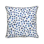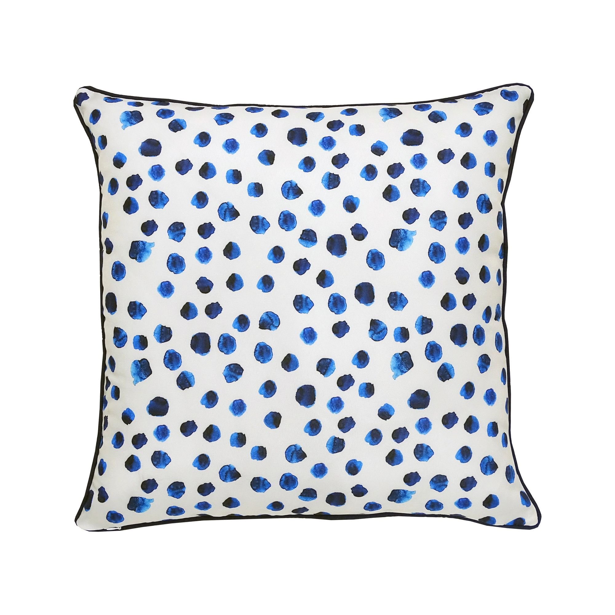 Watercolour-like polka dot patterns give this outdoor pillow a playful appeal. Against the sleek white backdrop, the royal and navy blue tones elevate the patio space.