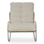 The Lyra rocking chair’s sleek aluminum frame harmoniously blends with synthetic wicker, creating an understated luxe feel. The plush cushion molds to your body, inviting relaxation. Remove the cushion to reveal intricate woven seating, offering a minimalist alternative.