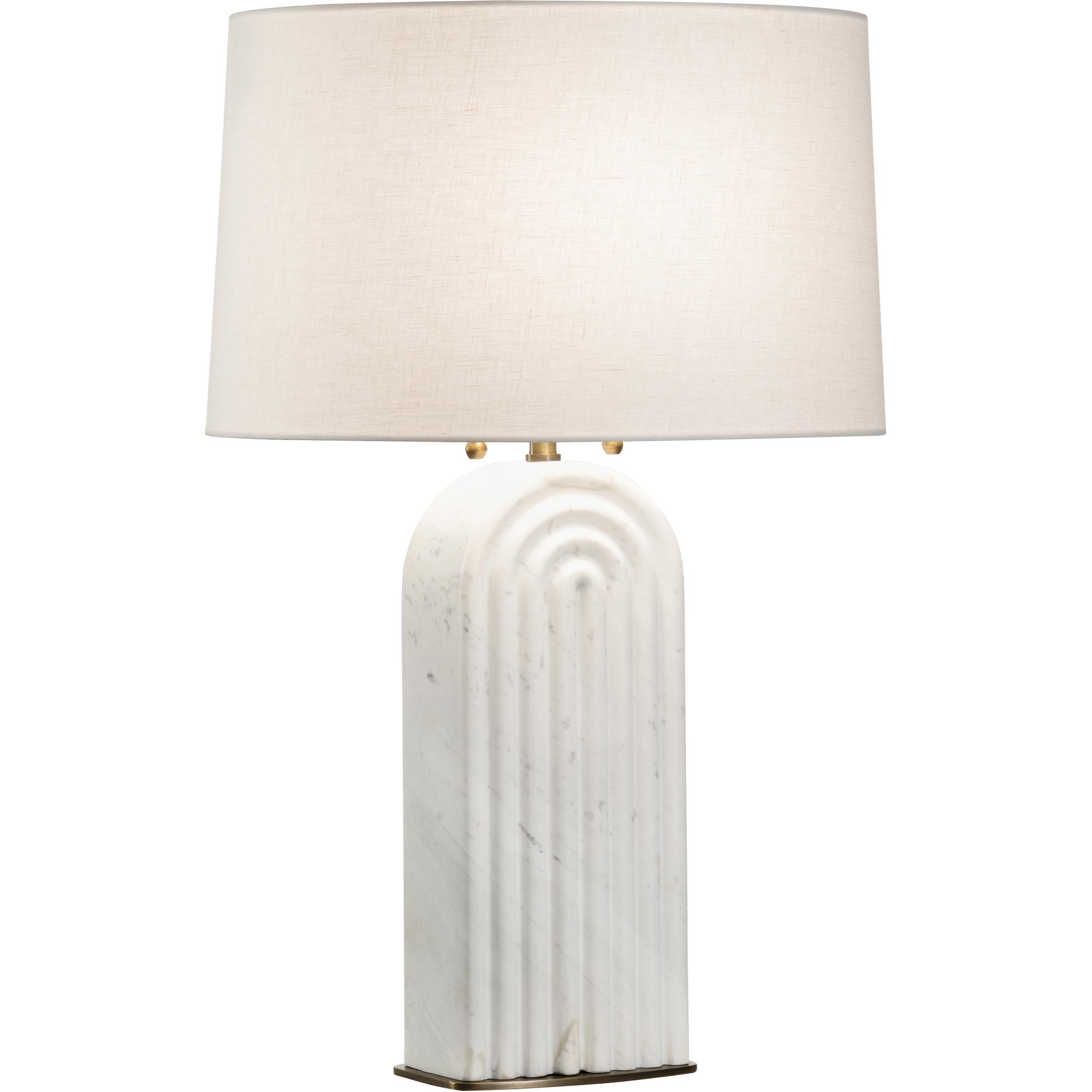 The Lyssy Table Lamp is a celebration of form, material, and Art Deco influence. The honed Carrera marble body is carved to create a delicate play of light and shadow.