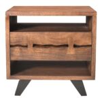 Crafted from solid Acacia wood and supported by geometric steel legs, the Madagascar nightstand offers an aesthetically pleasing rugged appeal blending rustic and industrial design. Thoughtfully designed with a single drawer between two open spaces to cater to bedside essentials, this piece is both practical and visually captivating.